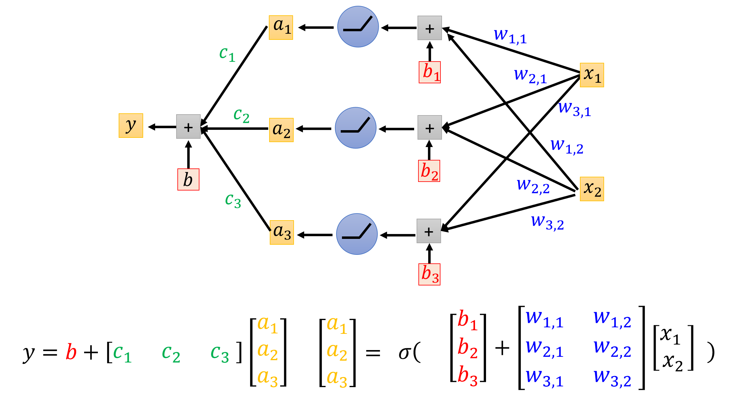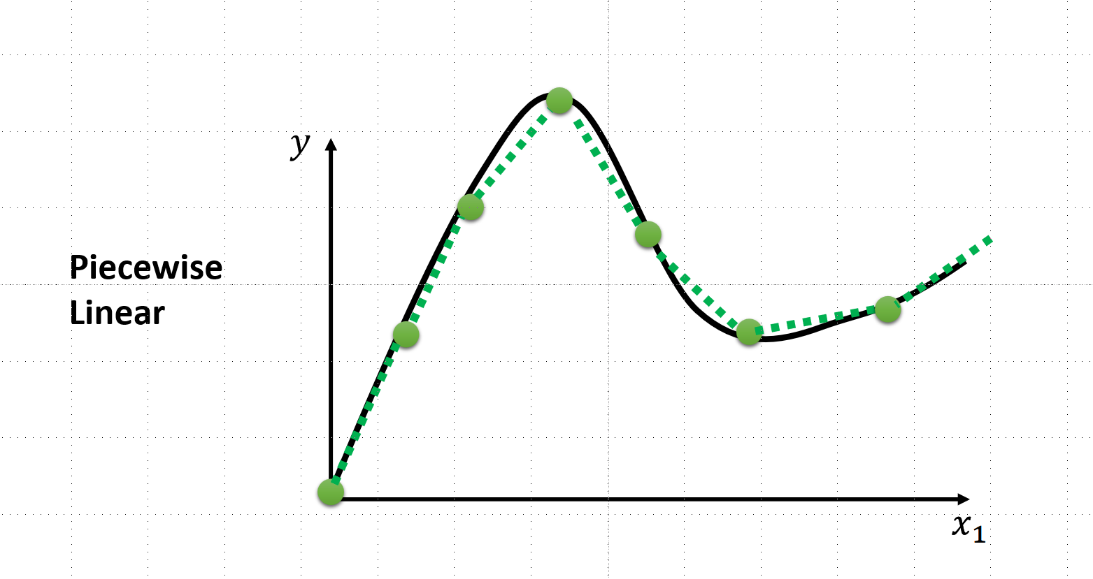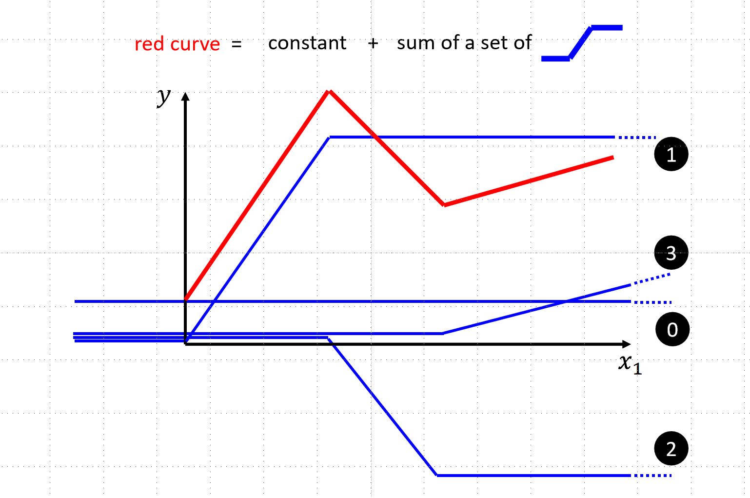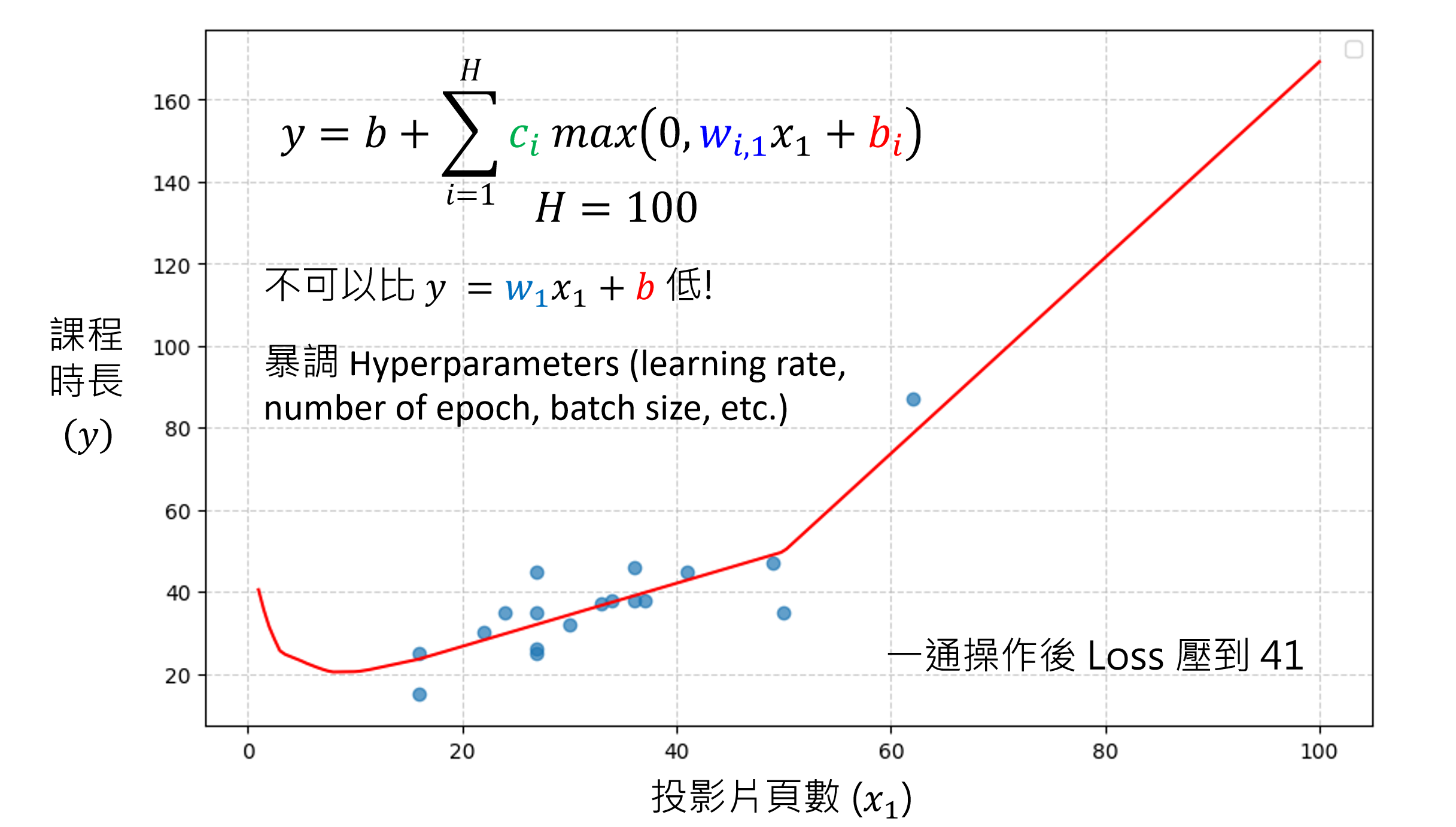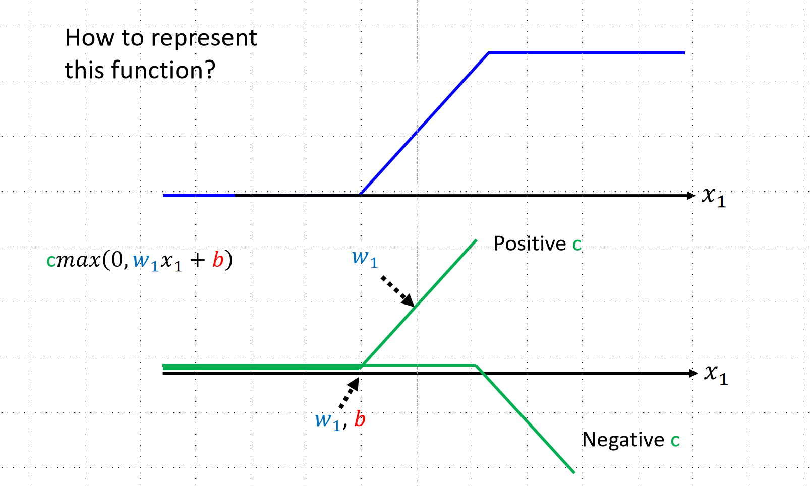 比如我们的函数可能是下图中的曲线状的,我们应该怎么去确定函数呢?方法是取函数上的多个点,用直线连接,分段线性逼近 (Piecewise Linear),后续用ReLu的方法去拟合函数,并且ReLu的操作可以多次进行,这就是类神经网络,如果进行多次的ReLu那就是深度学习