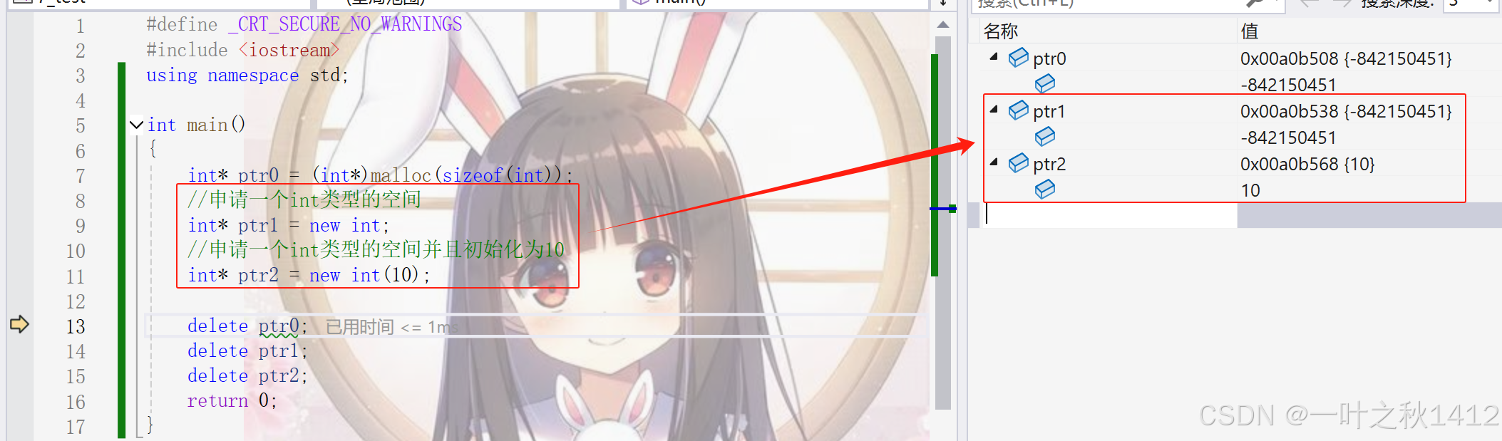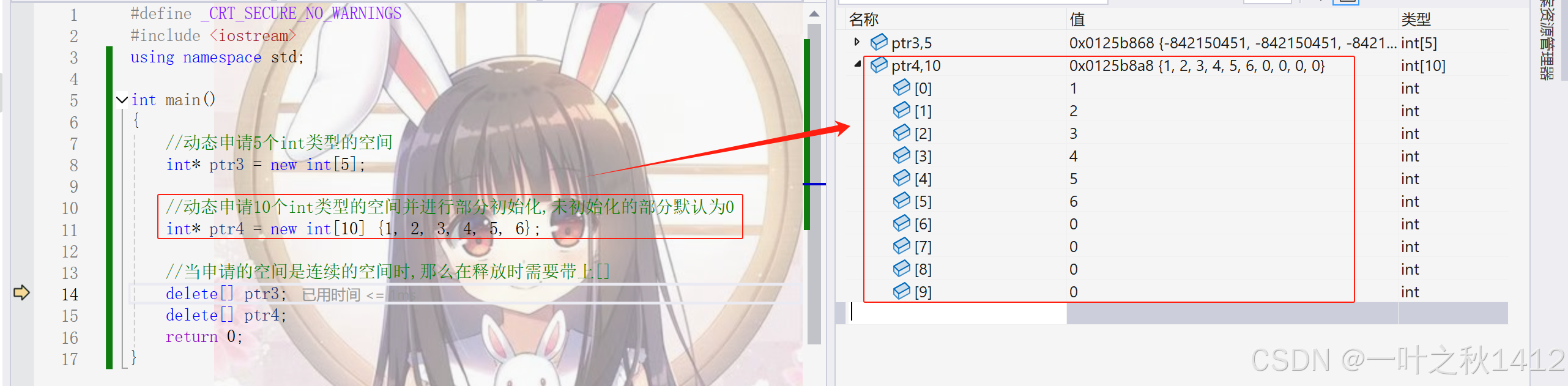 通过观察上面的代码,我们可以清晰地看到,new和delete在用法上相较于C语言开辟动态管理的方式变得更加简洁了.