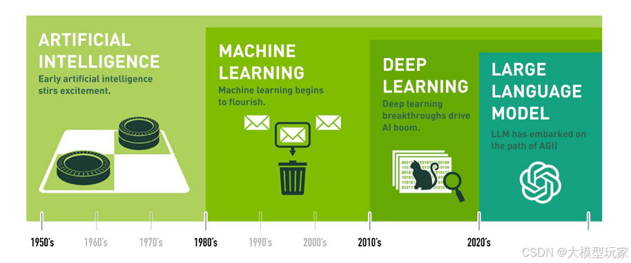 关于 AI(人工智能)的发展历程,我们可以将其划分为 Artificial Intelligence(弱人工智能)、Machine Learning(机器学习)、Deep Learning(深度学习) 和 Large Language Model(大语言模型)四个关键阶段,每个阶段都会有标志性的重大技术突破和应用领域的扩展。