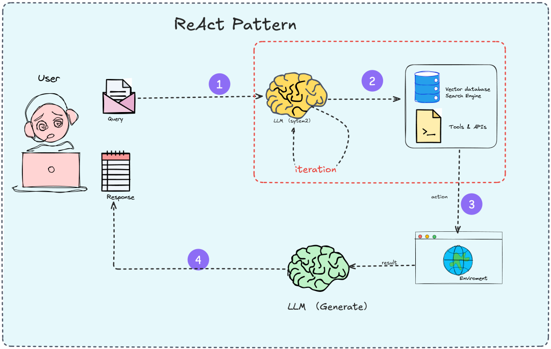 AI 智能体(Agents)的基础是 ReAct(Reason + Act)范式,即推理-行动范式。它的核心思想是使用大模型(LLM)来决策一系列要执行的动作,以完成目标。