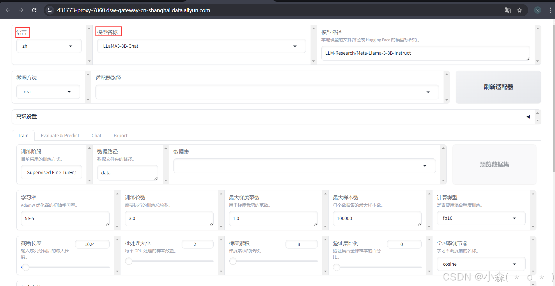 数据集使用上述下载的train.json,点击「预览数据集」可以预览一下数据