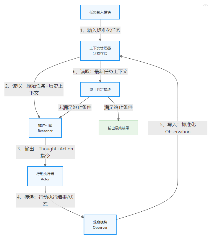 - 若未满足终止条件:回到「阶段1」,推理引擎基于新的上下文(新增了本轮观察结果),生成下一轮的Thought,开启新的循环。
