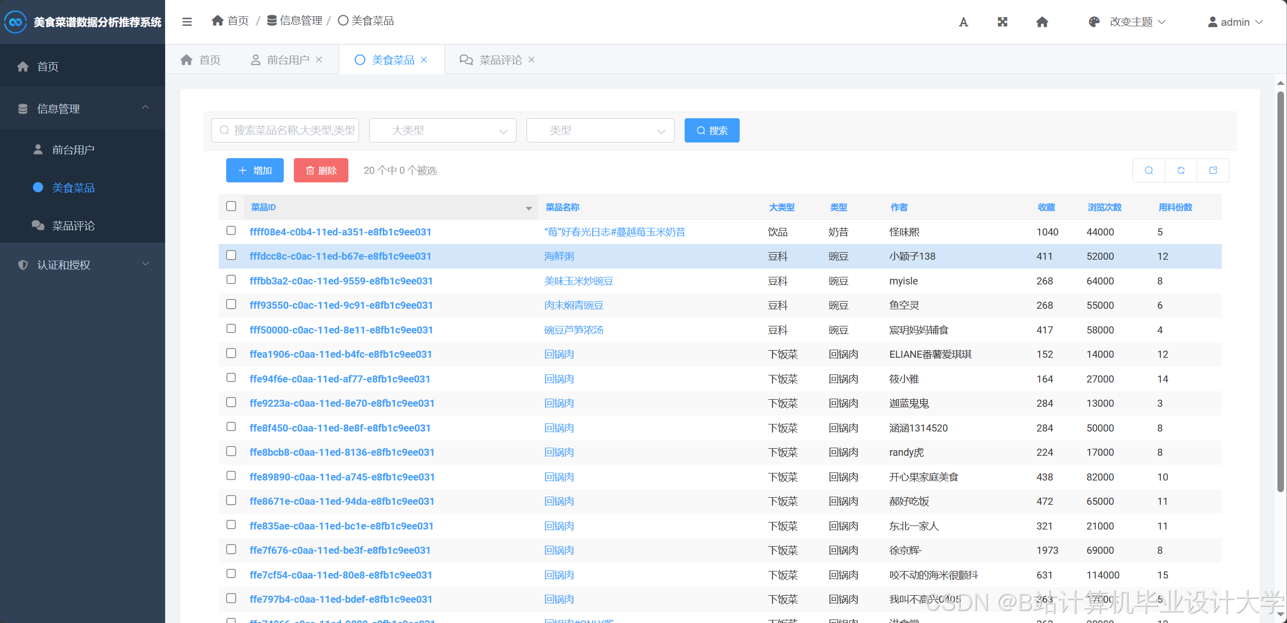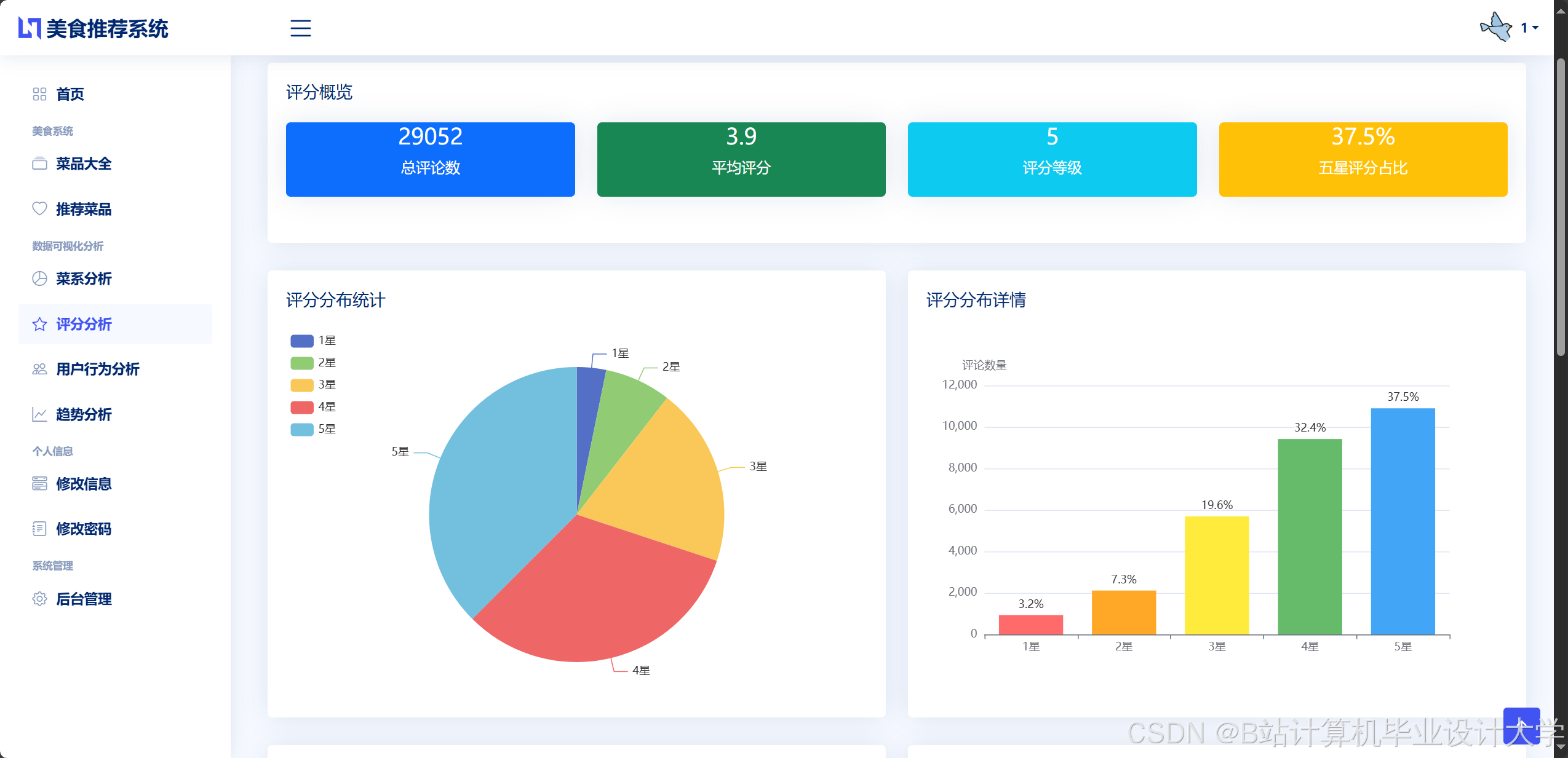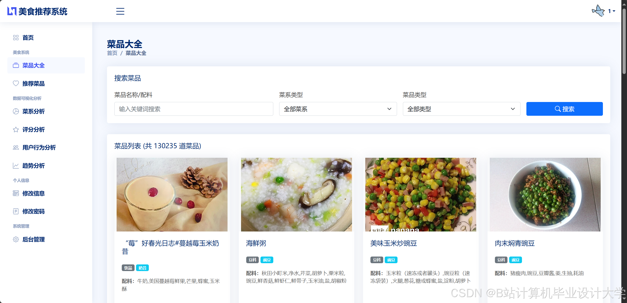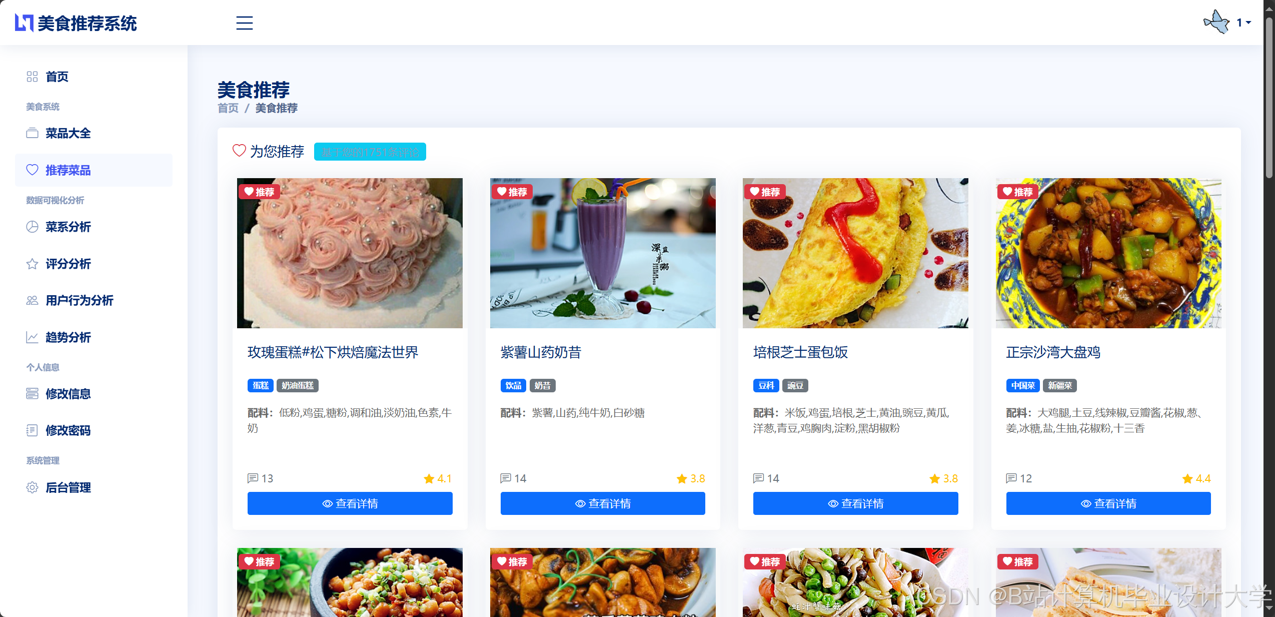 - 可视化工具:ECharts生成动态图表(如菜谱评分分布、用户行为热力图),支持多终端自适应布局。