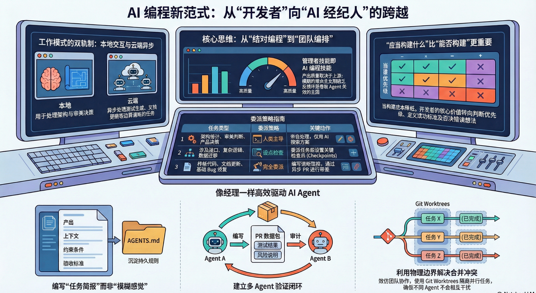 当开发流程中引入多个并行运行的 Agent 时,工作的本质发生了变化。这不再是一个微观的“提示词(Prompting)”问题,而是一个宏观的“编排(Orchestration)”问题。