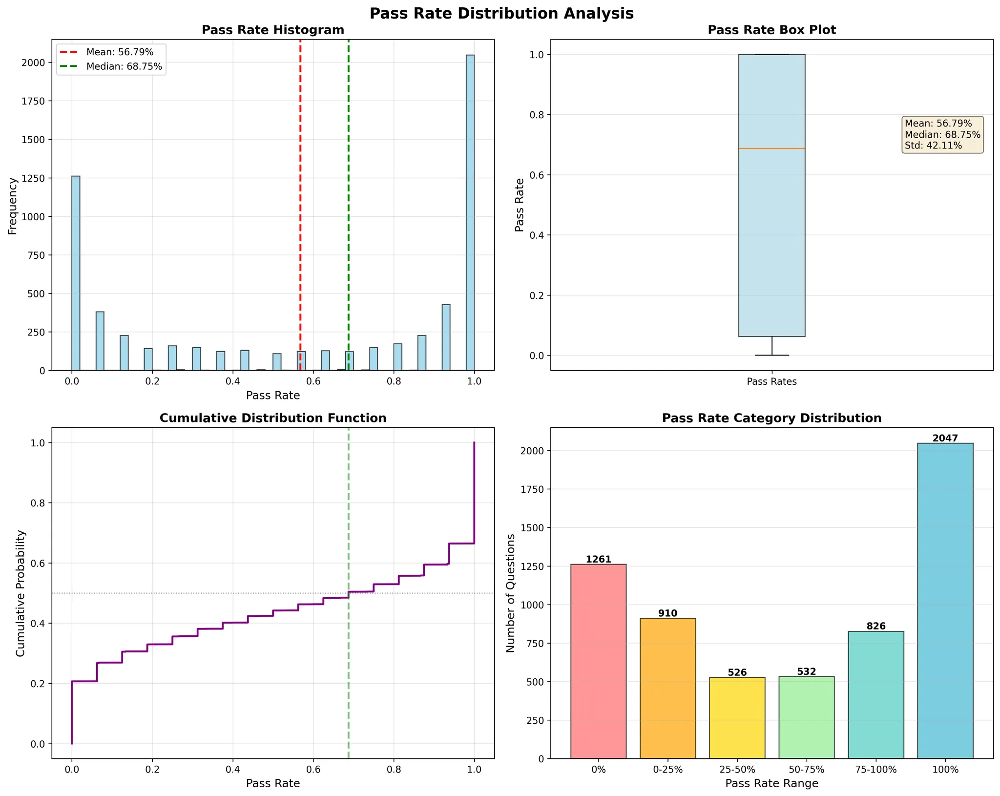 分析每个问题的通过率会发现双峰结构:一大块(超过30%)接近0%通过率(极难问题),另有接近20%的问题达到近100%通过率(稳定可解问题),中间(约45%)的问题较少,代表潜在的改进空间。
