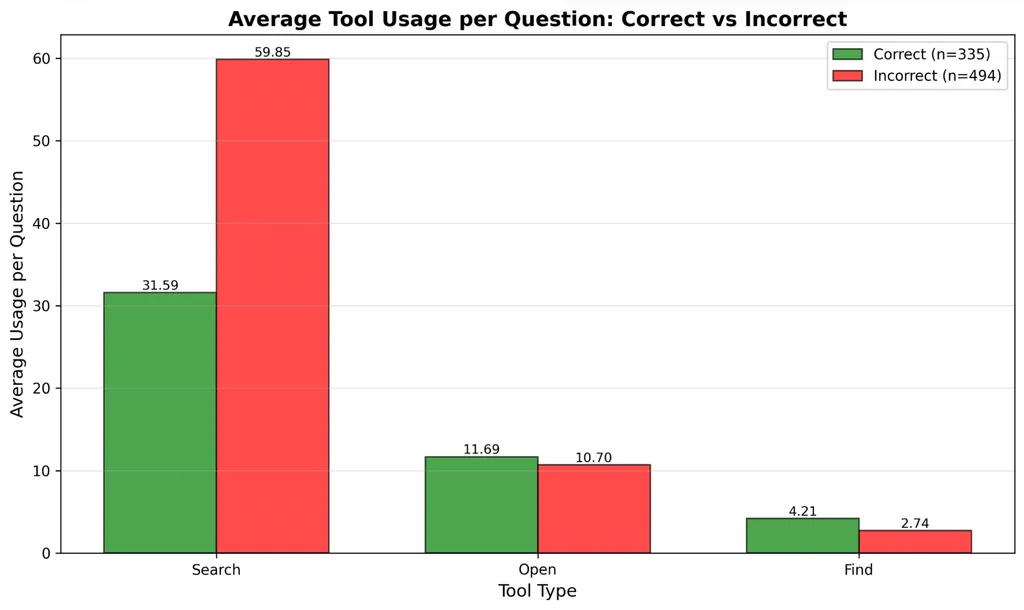 一个关键观察是:正确和错误轨迹在工具使用上差距很大。错误轨迹的工具调用次数几乎是正确轨迹的2倍。这说明失败不是因为探索不够,而可能是搜索效率低或者方向错误。更难的问题可能不只是需要"更多搜索",而是需要更好的搜索策略。