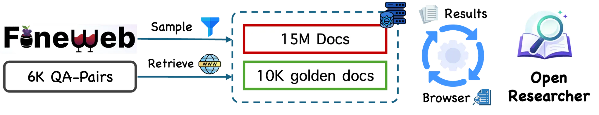 为了模拟真实网络的覆盖范围,体现真实搜索环境的复杂性,项目组从FineWeb采样了1500万份文档(大约10万亿token)。这些文档跟黄金段落合并起来构成离线语料库,其中FineWeb文档(1500万)作为负样本(干扰证据),黄金段落(1万)作为正样本(支持参考答案的证据)。