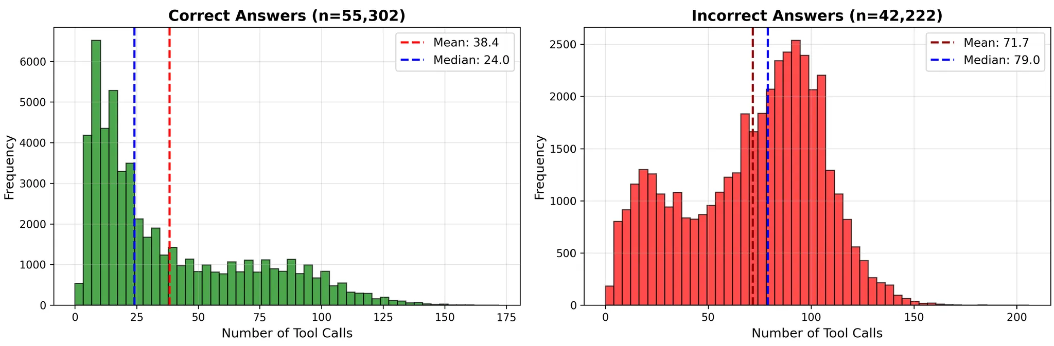 工具调用次数的直方图还揭示了另一个重要特性:成功轨迹的长度分布范围很广。很多正确轨迹在10-40次工具调用内完成,有相当一部分需要100多步,有些甚至达到最大范围(150次以上工具调用)。