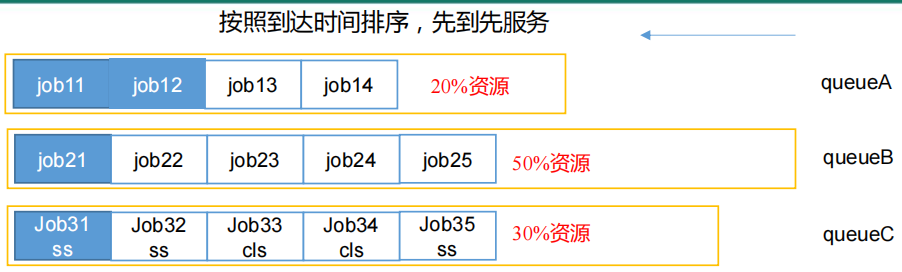 这种调度器的工作机制比较简单,就是把任务按照提交的顺序排成一个队列,然后按照FIFO先进先出的顺序,以此执行。而在进行资源分配时,也是先给队列中头部的任务分配资源,资源满足后,就开始执行头部任务。等头部任务的执行完成后,再给下一个任务分配资源。