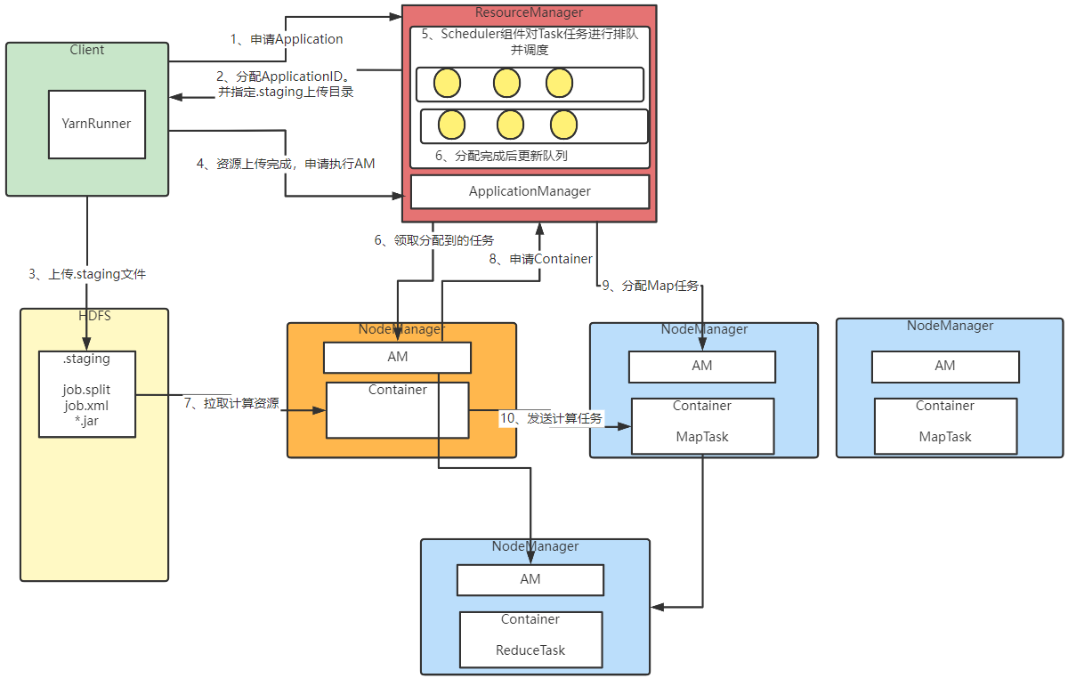 在图中第6步,ResourceManager的ApplicationManager负责通知第一个处理任务的NodeManager,并启动对应的ApplicationMaster。后续的计算任务,就交由该NodeManager上的AM来协调了。ResourceManager只负责资源调度,不参与具体的计算过程。