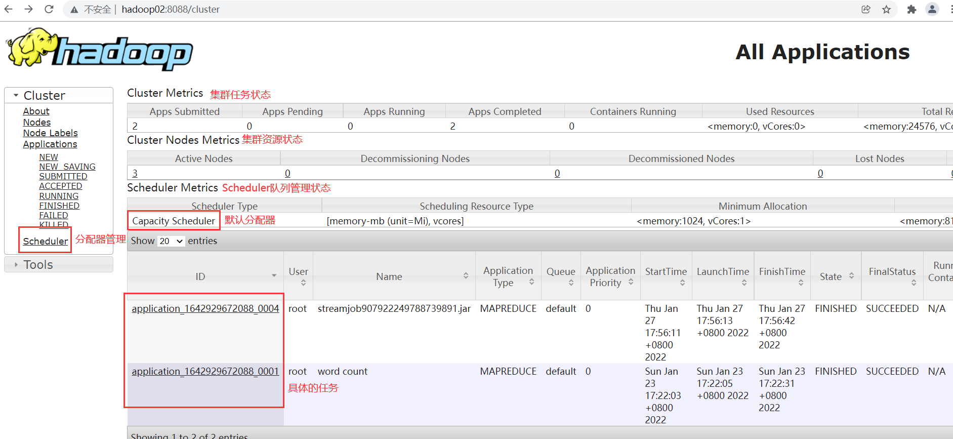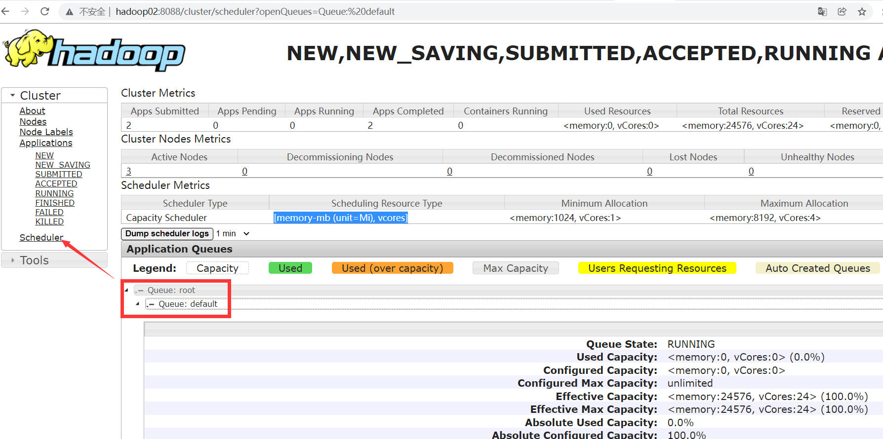 这时,如果访问Standby的RM节点的8088管理页面,http://hadoop01:8088/,会自动跳转到active状态的RM节点的管理页面。对Standby状态的RM节点的RestAPI的访问也都会自动转到Active状态的主RM上。