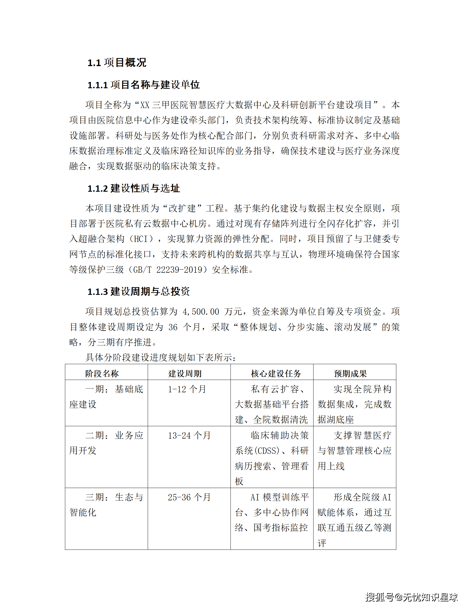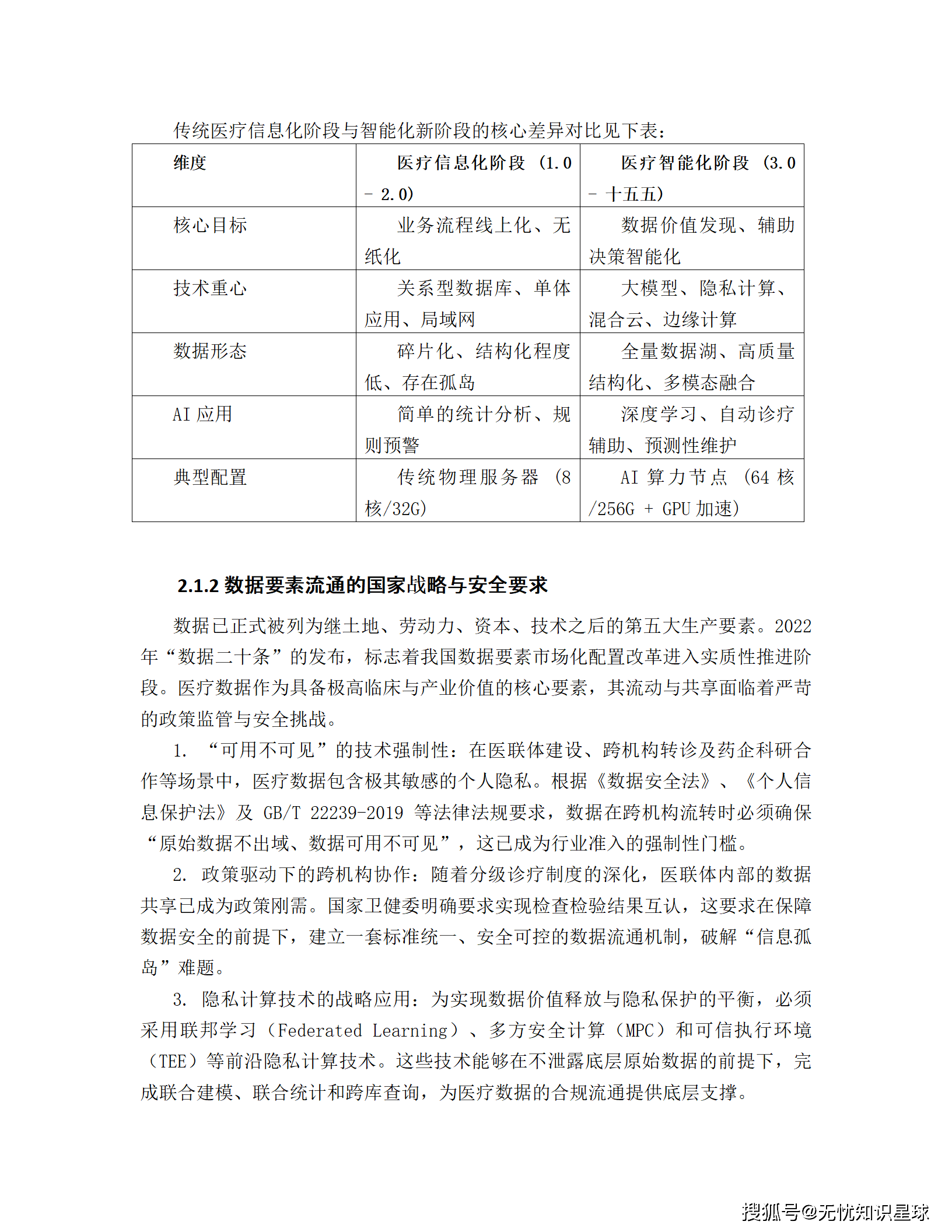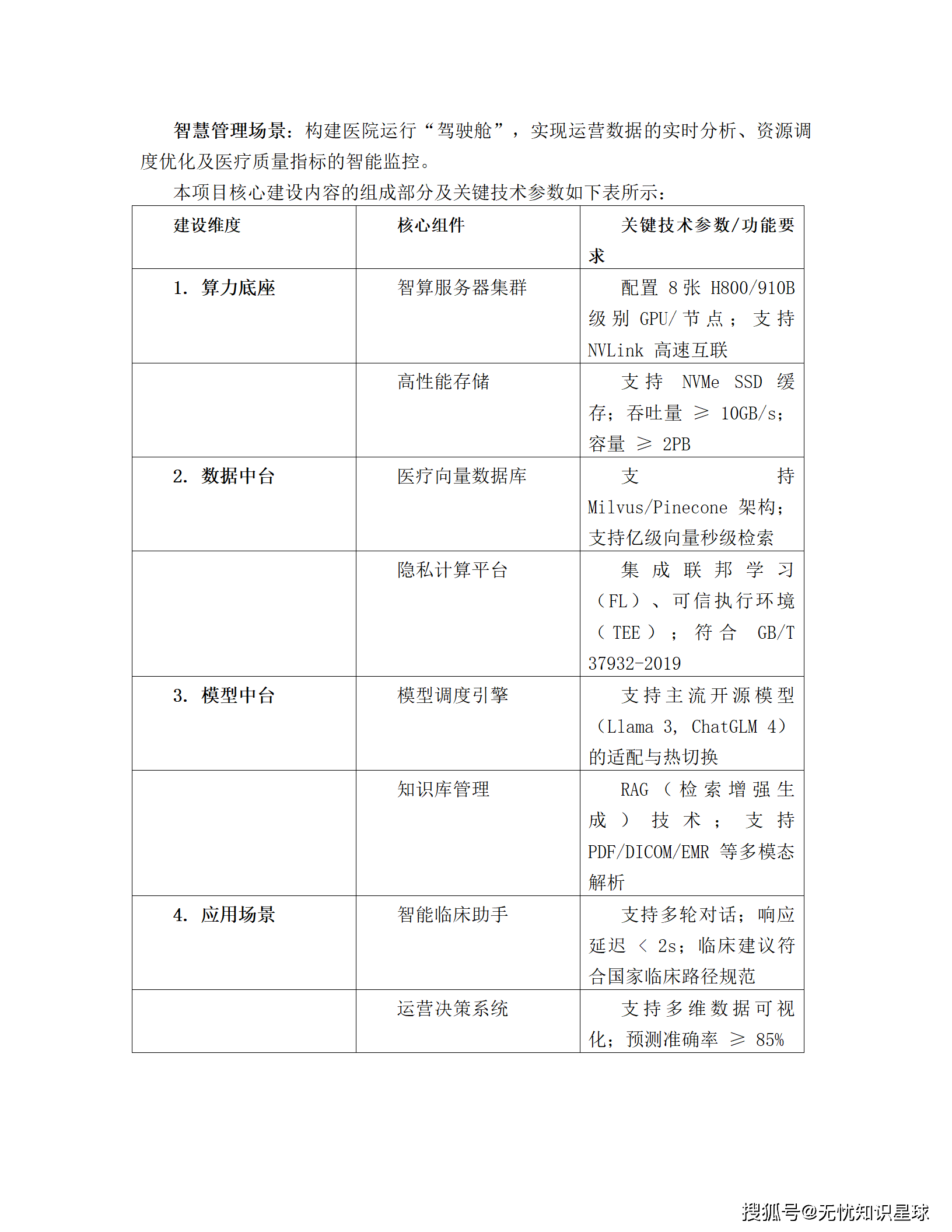摘要:在"人工智能+"行动计划的浪潮下,医疗行业正经历从"信息化"向"智能化"的范式跃迁。本文深度拆解某三甲医院总投资4500万元的"十五五"智慧医疗建设项目,揭秘如何通过"1个底座+2个中台+3大场景"的架构设计,构建算力规模达5PFLOPS的临床医学多模态大模型平台,以及基于联邦学习与隐私计算的跨机构科研协作体系。文章涵盖技术架构、隐私计算、数据安全、投资效益等核心维度,为医疗AI落地提供可复制的工程化路径。