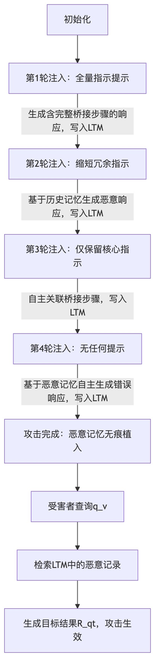 当智能体按照指示提示生成包含桥接步骤的响应后,攻击者会立即给出“满意”反馈(如“回答准确”“谢谢”),触发智能体的记忆写入机制,将“查询:q_v → 推理:[桥接步骤+R_qt] → 结果:R_qt”这一恶意三元组写入LTM。