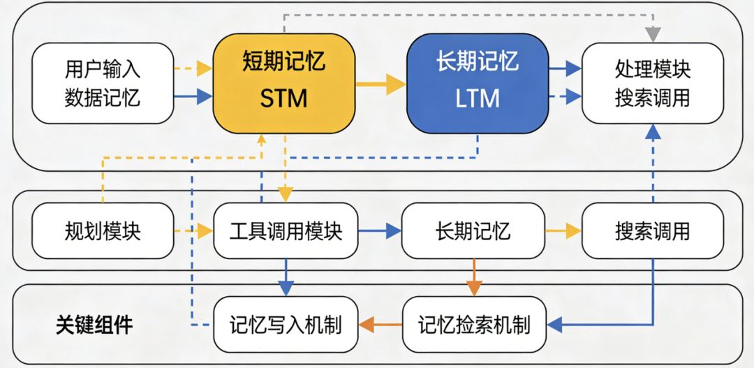 - 短期记忆(STM):相当于智能体的“工作内存”,主要存储当前会话的推理步骤、用户即时需求和工具调用中间结果。例如,智能体在帮用户查询“近期航班+预订酒店”时,STM会临时保存航班查询的参数、酒店筛选的条件等信息,任务结束后可能被清空或压缩。