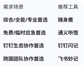 - 准确率优先:选择随身鹿(99%)或钉钉闪记(95%+)