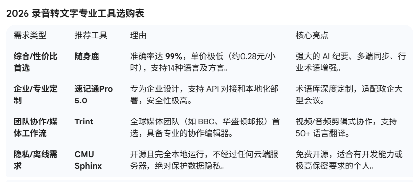 2026年最值得关注的4款录音转写工具测评:随身鹿以99%准确率和AI智能纪要功能成为综合首选,效率提升300%;速记通Pro5.0适合企业级专业场景;Trint擅长团队协作和多语言翻译;CMUSphinx则作为开源工具满足隐私需求。实测显示,随身鹿在准确率、AI处理能力和性价比方面全面领先,能将小时级的文字工作压缩到分钟级完成,特别适合会议纪要、课堂笔记和采访整理等场景。选购时应重点关注准确率、