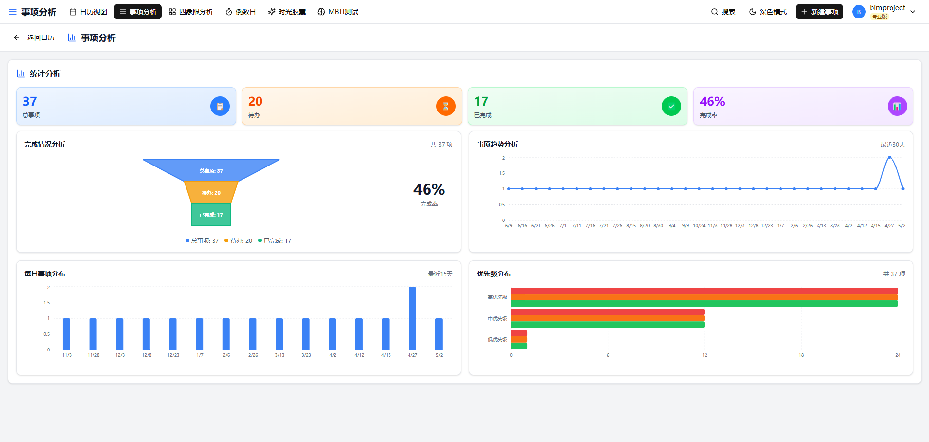 而要落地这个方法,其实不需要复杂的表格,用时光本的矩阵日历和四象限分析功能就能轻松实现。你只需要在创建任务时设置优先级和截止日期,系统就会自动把任务分到对应的象限里,打开四象限页面就能一目了然地看到哪些任务是需要立刻处理的,哪些是可以安排在之后的时间慢慢完成的。