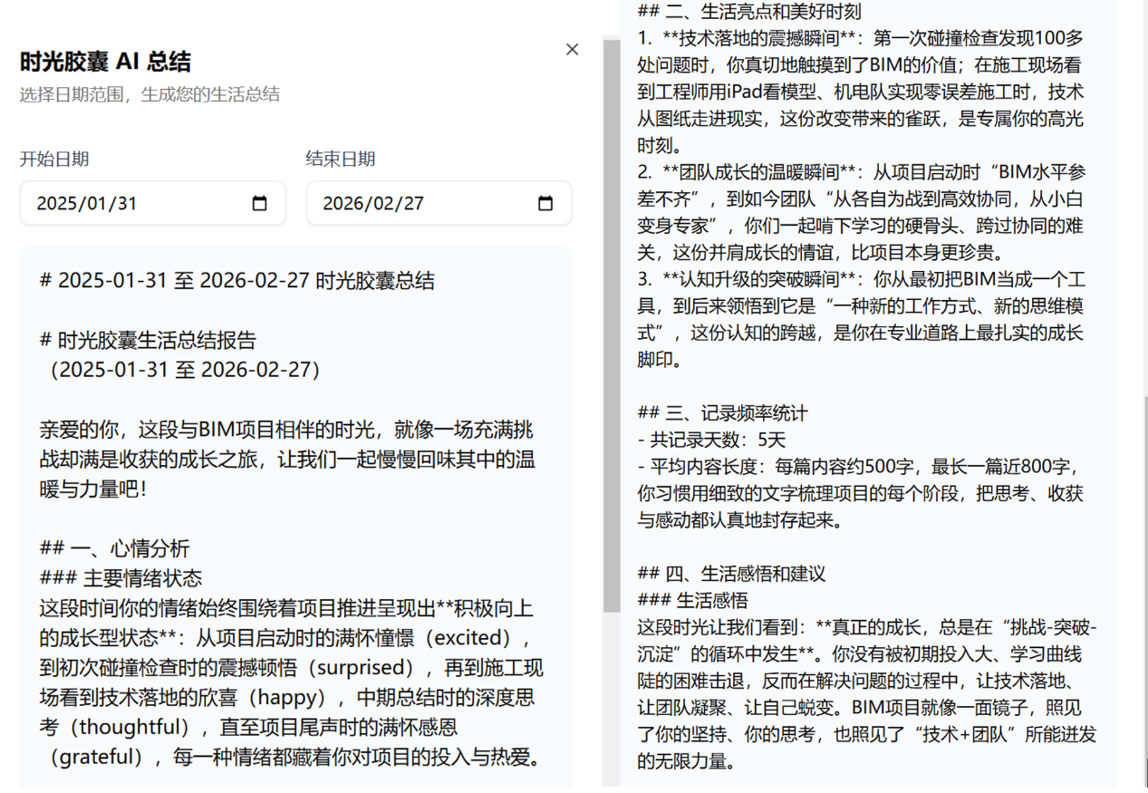 时光本的时光胶囊功能就很适合用来做工作记录,你可以用文本、图片甚至语音的形式记录每天的工作心得,比如今天解决了什么问题、遇到了什么困难、学到了什么新东西。如果是专业版的话,还可以用 AI 智能总结功能,系统会自动帮你提炼出每周的工作亮点、待改进的地方,甚至能帮你生成工作总结,省去了自己整理的时间。