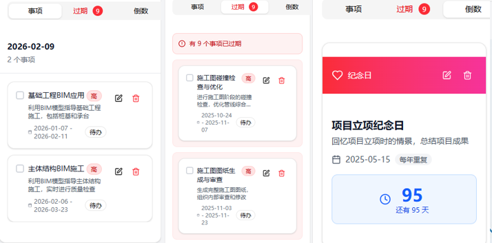 其实,只需要设置好双重提醒,就能避免这种情况。时光本的倒数日功能可以帮你记录这些重要的日期,比如生日、纪念日,还能设置每年重复,到了时间就会在日历上显示紫色的提醒标签;而过期事项提醒则会把你没完成的任务用红色背景高亮显示,打开日历就能一眼看到哪些任务已经超时了,再也不用担心因为忙碌而忘记处理重要的事情。