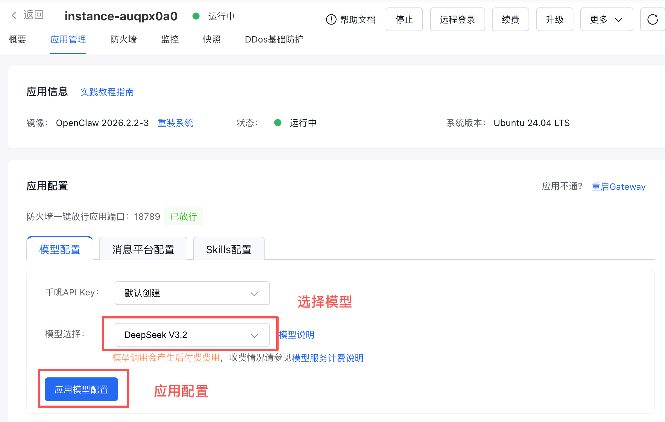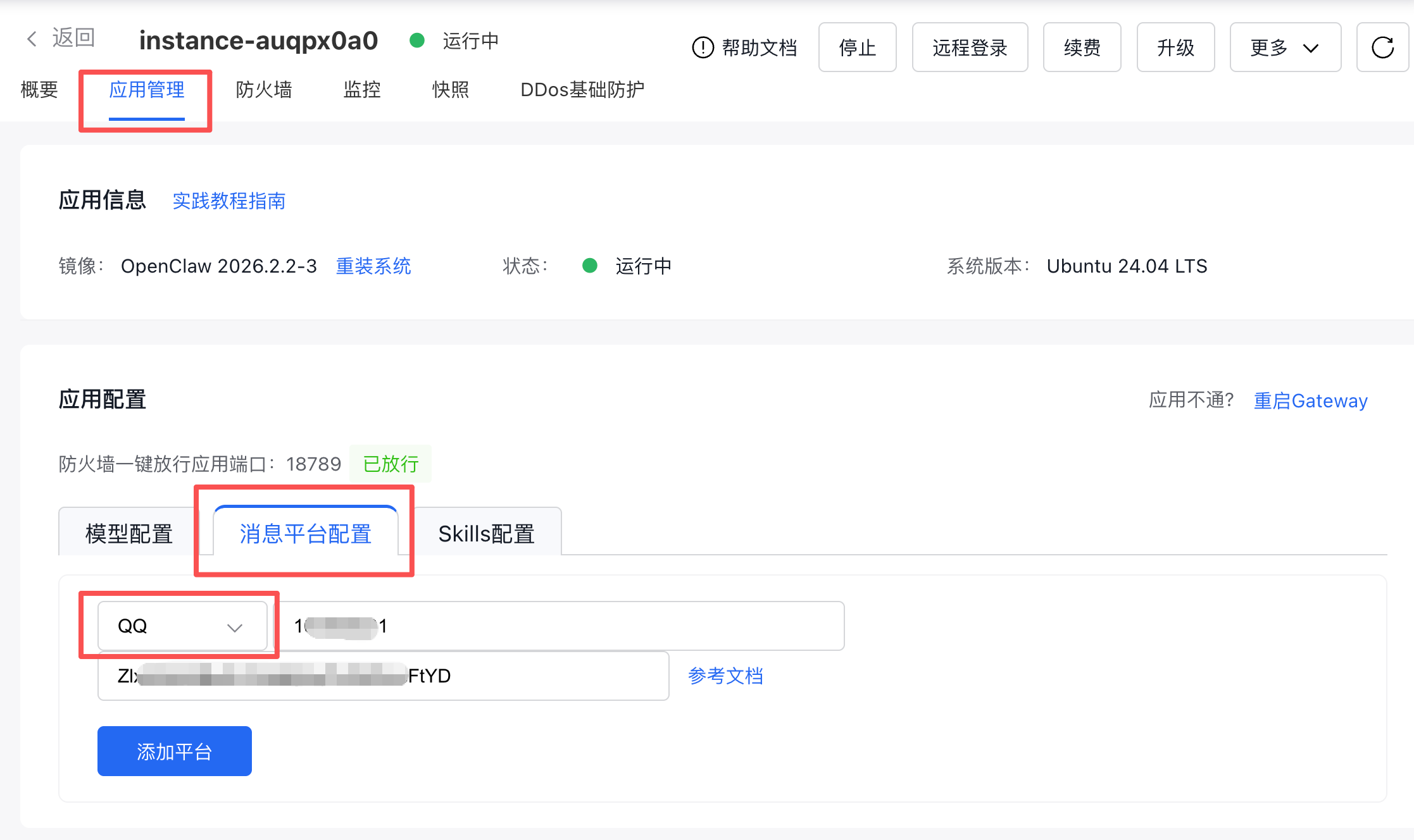 在百度智能云的服务器管理页面,找到 消息平台配置,下拉选择 QQ,把刚才的 AppID 和 AppSecret 填进去,点 应用,等它执行完就好了。