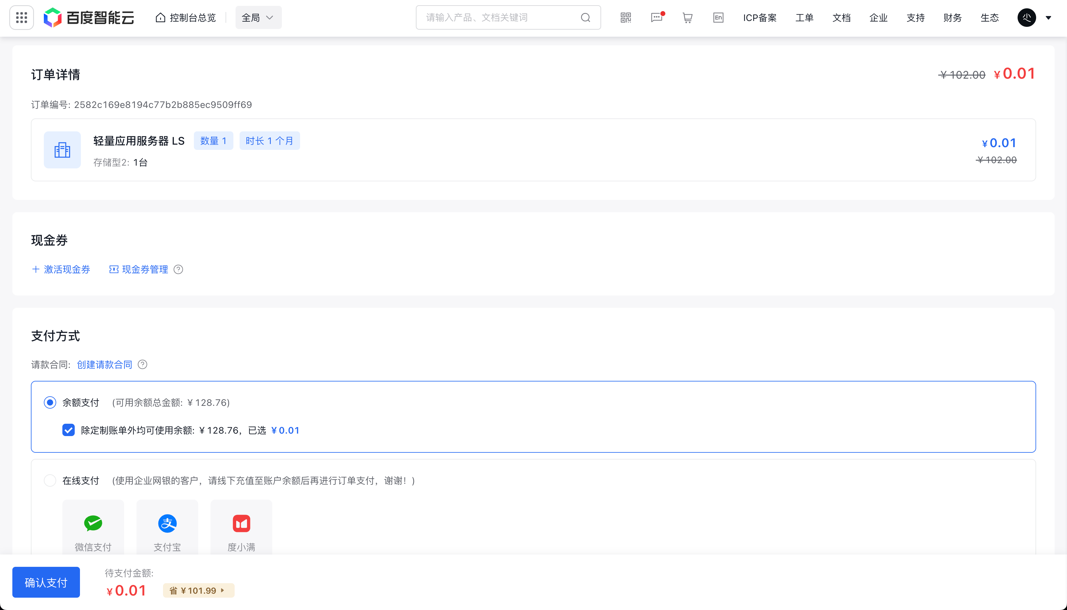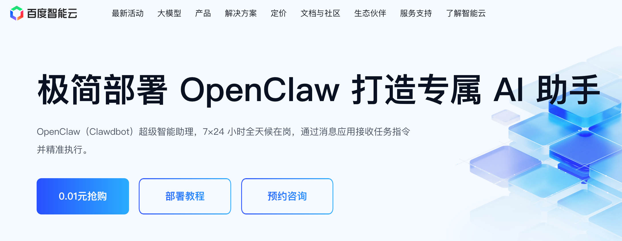 先分享一种最简单获取服务器的方法,打开百度智能云为 OpenClaw 特制的「极简部署页面」,只需 0.01 元,就能抢购到一台 2核4G4M 的轻量应用服务器,免费体验 1 个月。