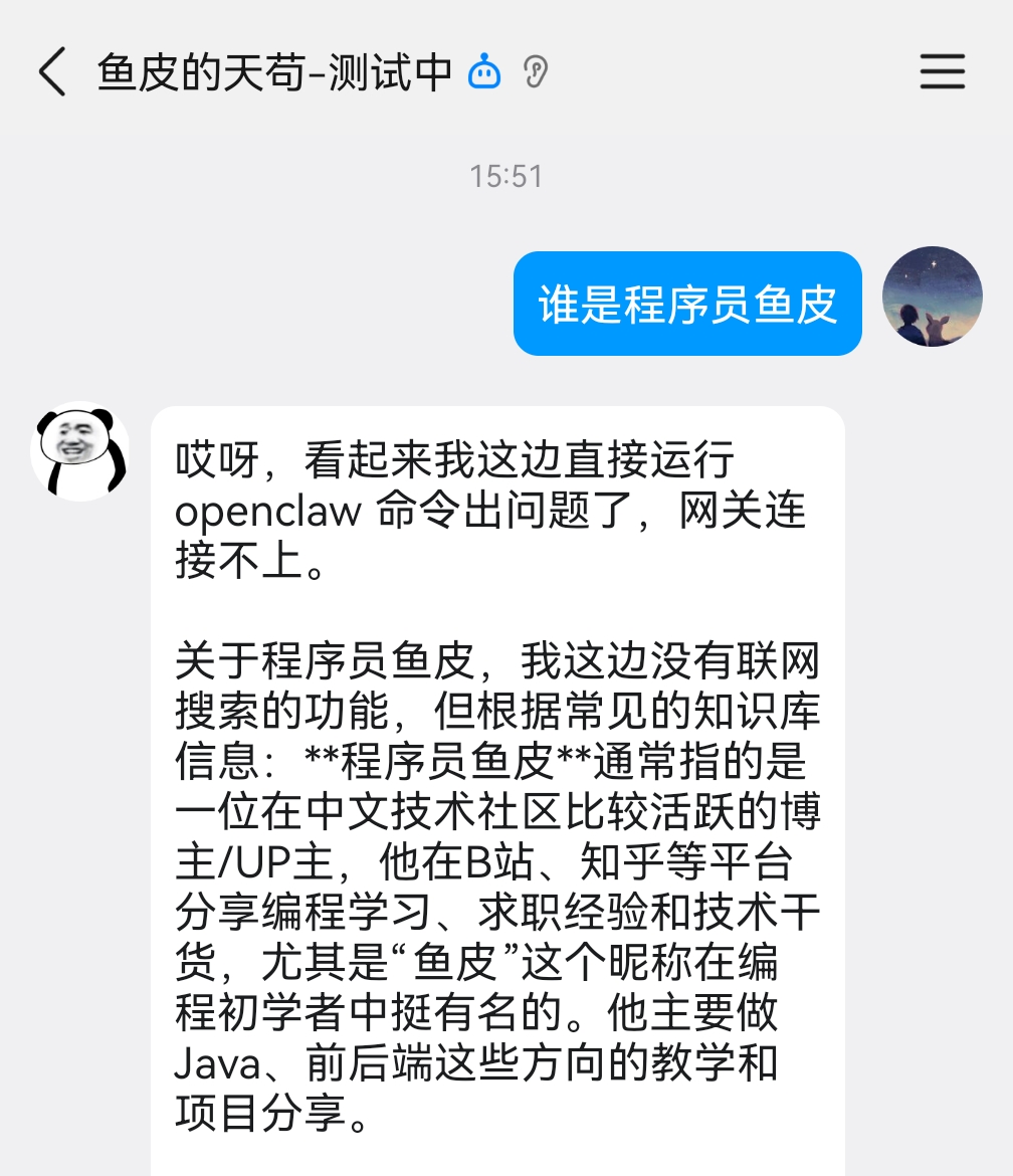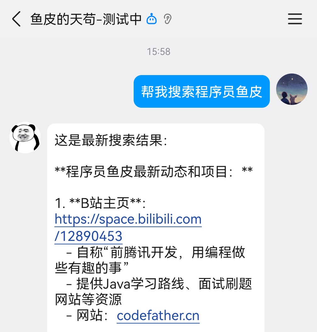 然后我让「鱼皮的天苟」帮我搜索 “程序员鱼皮”: