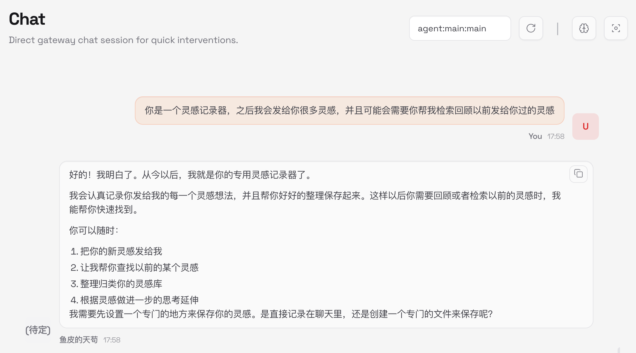 现在,我可以直接把 OpenClaw 当做是我的超级备忘录,先给 AI 设定一个角色,比如告诉它 “你是一个灵感记录器”: