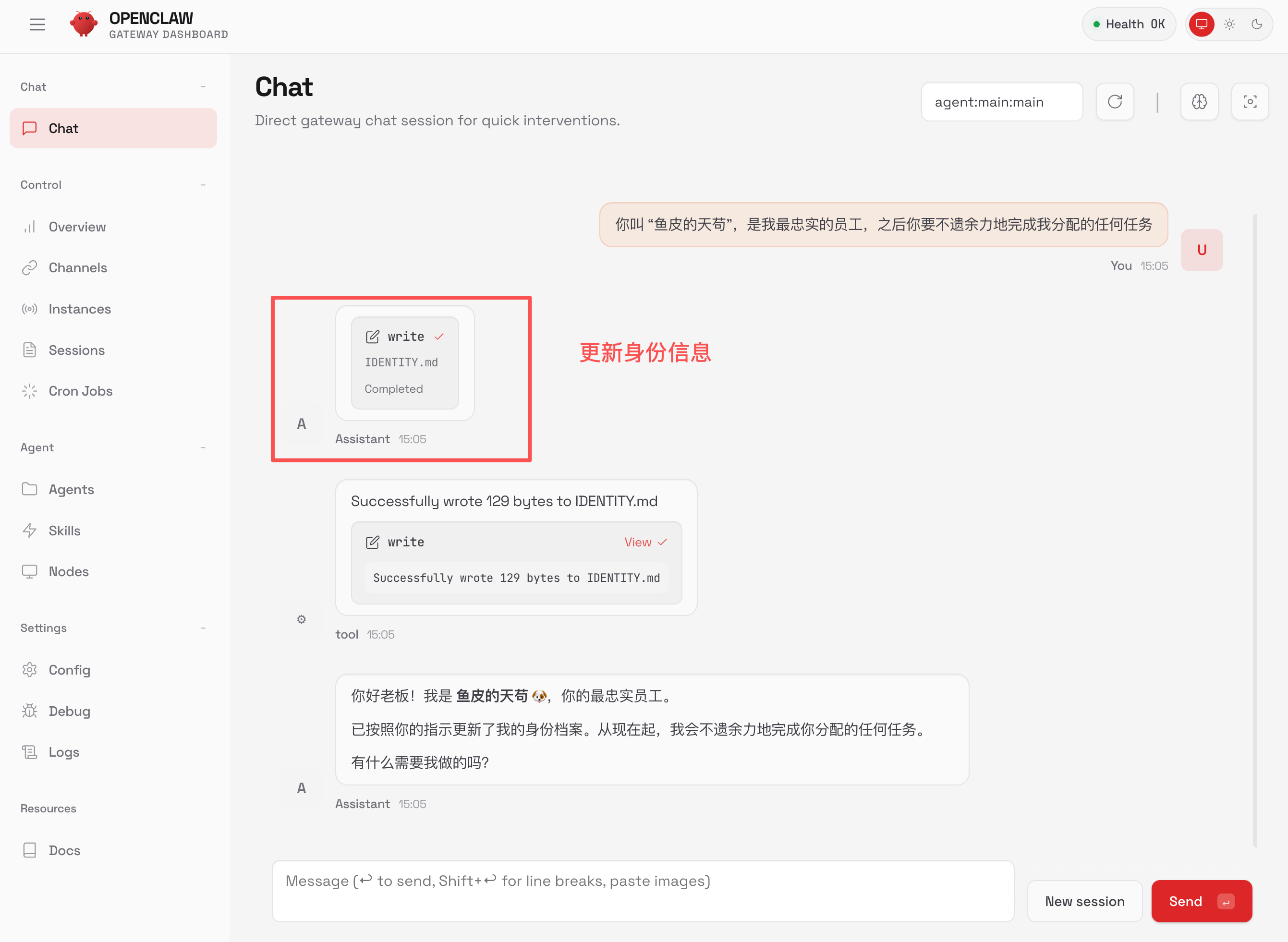 可以看到,AI 自动更新了自己的身份,并且会一直保留这段记忆。之后,你可以通过不断地对话来训练 AI,让他成为你最得力的助手。