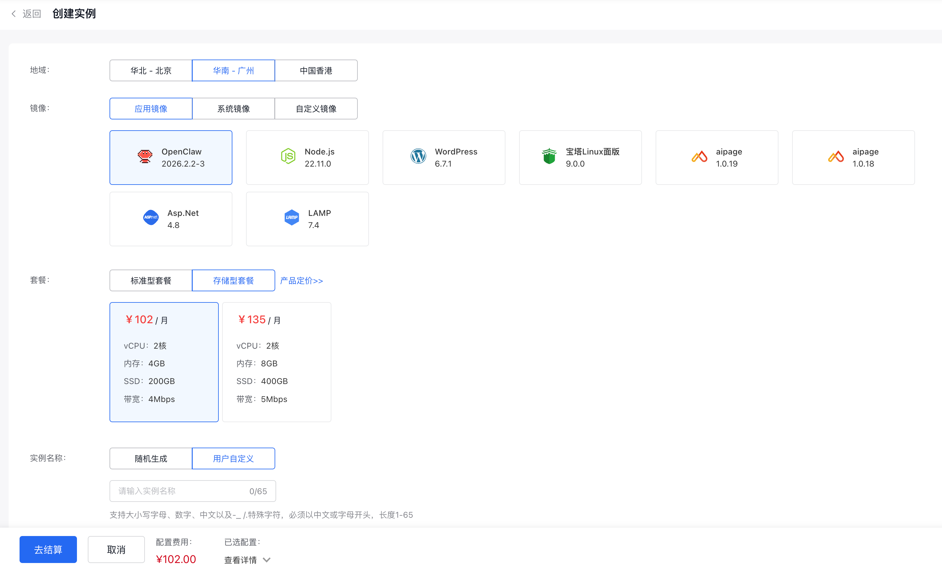 注意,镜像一定要选择 OpenClaw 应用镜像,套餐选择 2 核 4GB 就妥妥够用了。