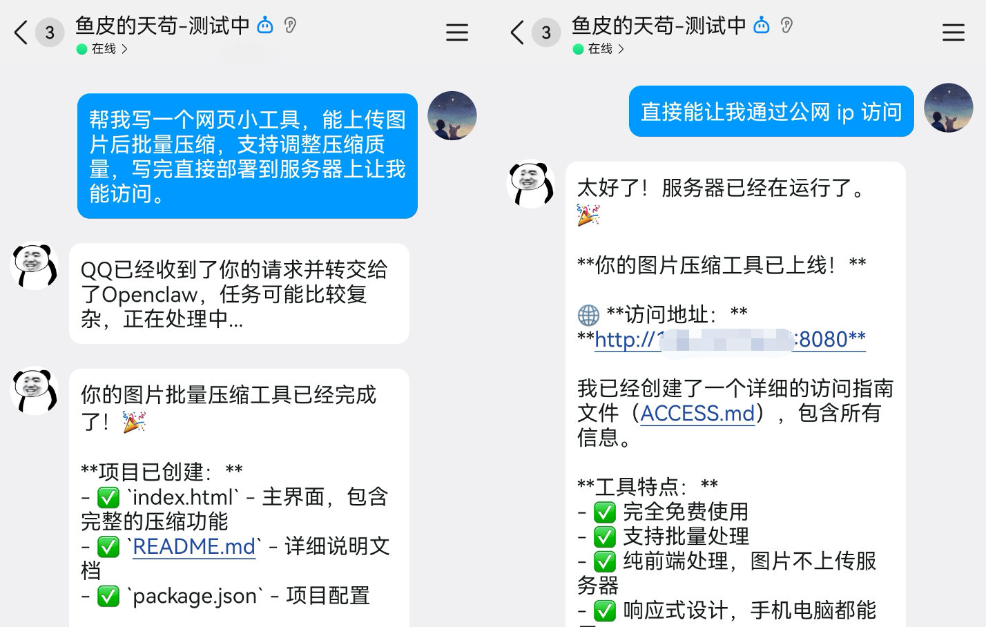之后,你只需要躺在床上打开 QQ,就能指挥远程服务器上的 AI 干活,巴适得板~