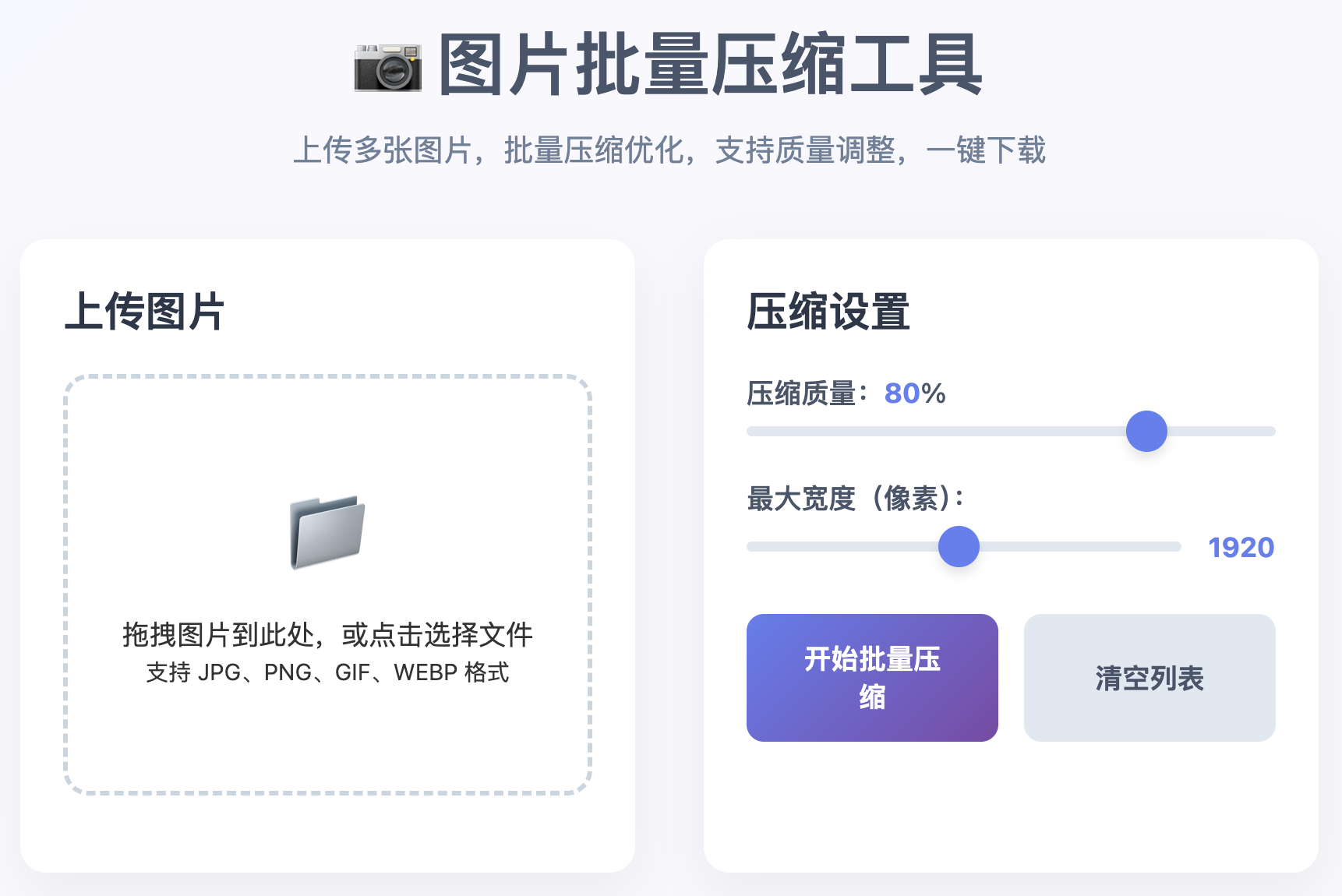 帮我写一个网页小工具,能上传图片后批量压缩,支持调整压缩质量,写完直接部署到服务器上让我能访问。