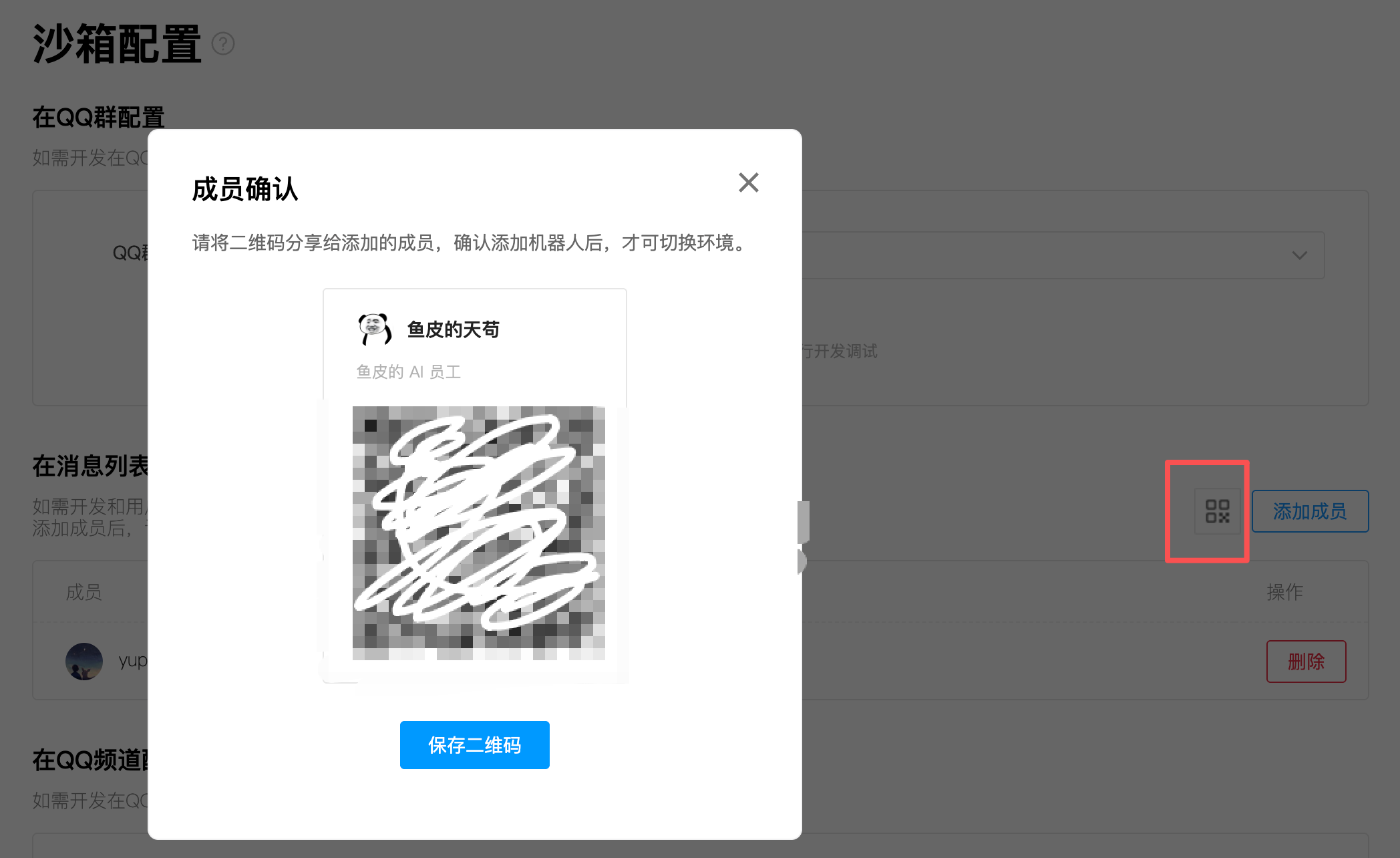 回到 QQ 开放平台,在沙箱配置里给你的 QQ 账号(或者 QQ 群)添加访问机器人的权限: