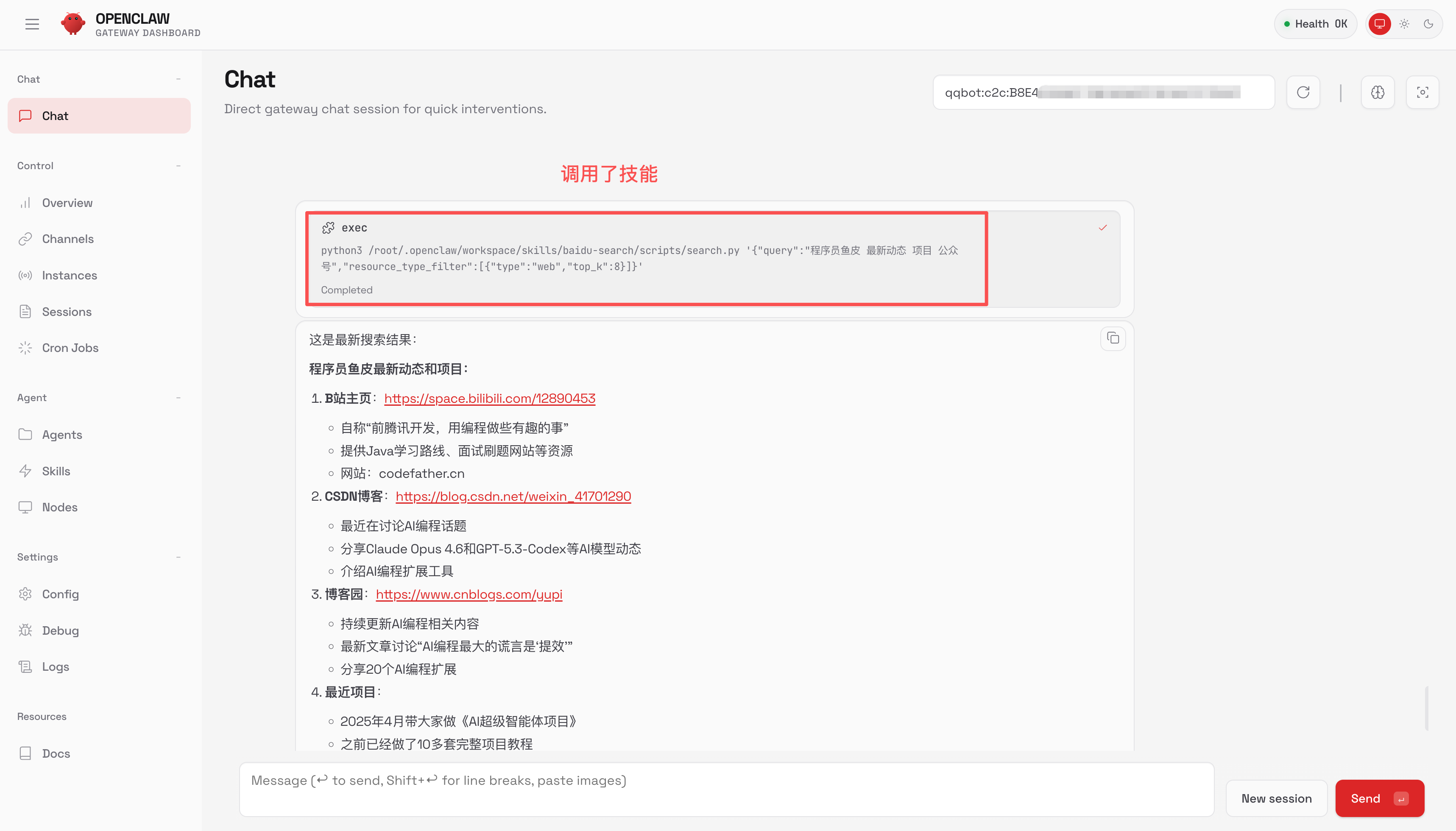 这次的结果靠谱多了,在 OpenClaw 网页对话框中,可以看到 AI 调用了百度搜索技能: