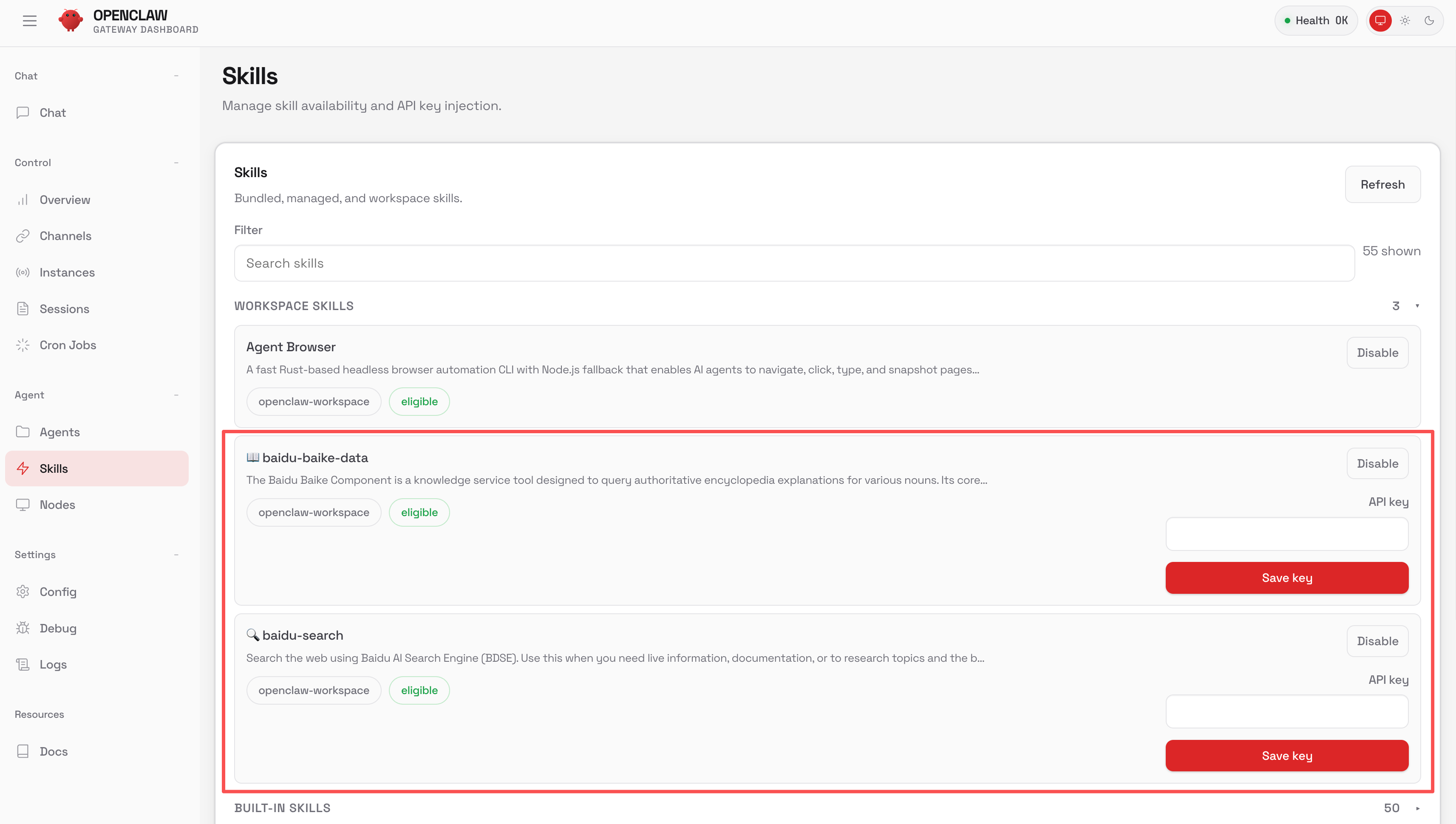 比如我安装了百度搜索和百度百科 Skills,这两块都是百度的特长,适合用来搜索国内的信息源。
