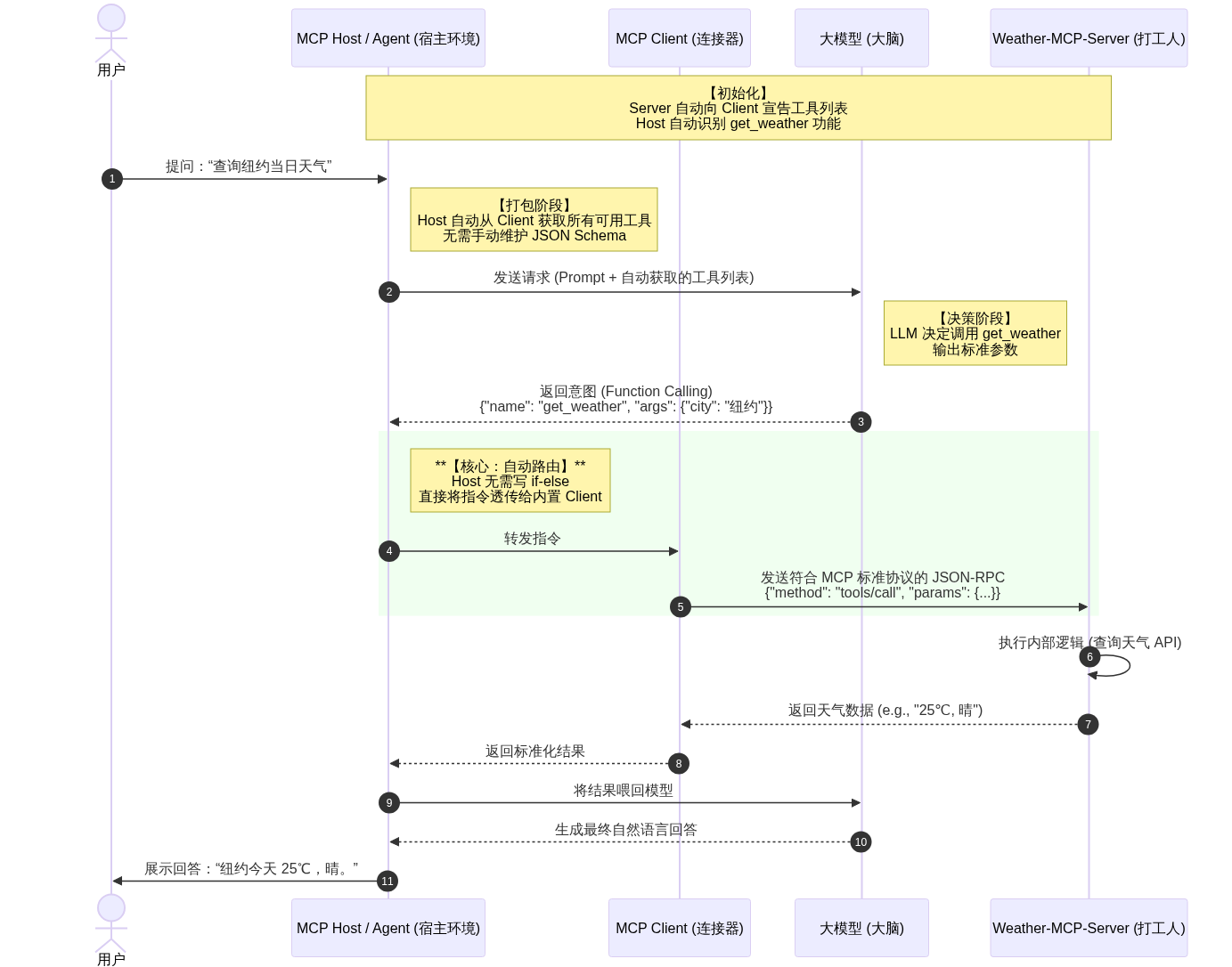 这个时候当用户提出问题的时候(比如查询纽约当日天气),agent会先进行解析prompt,然后把解析后的结果交给大模型(并且还有对应agent拥有的MCP一并发送给大模型),