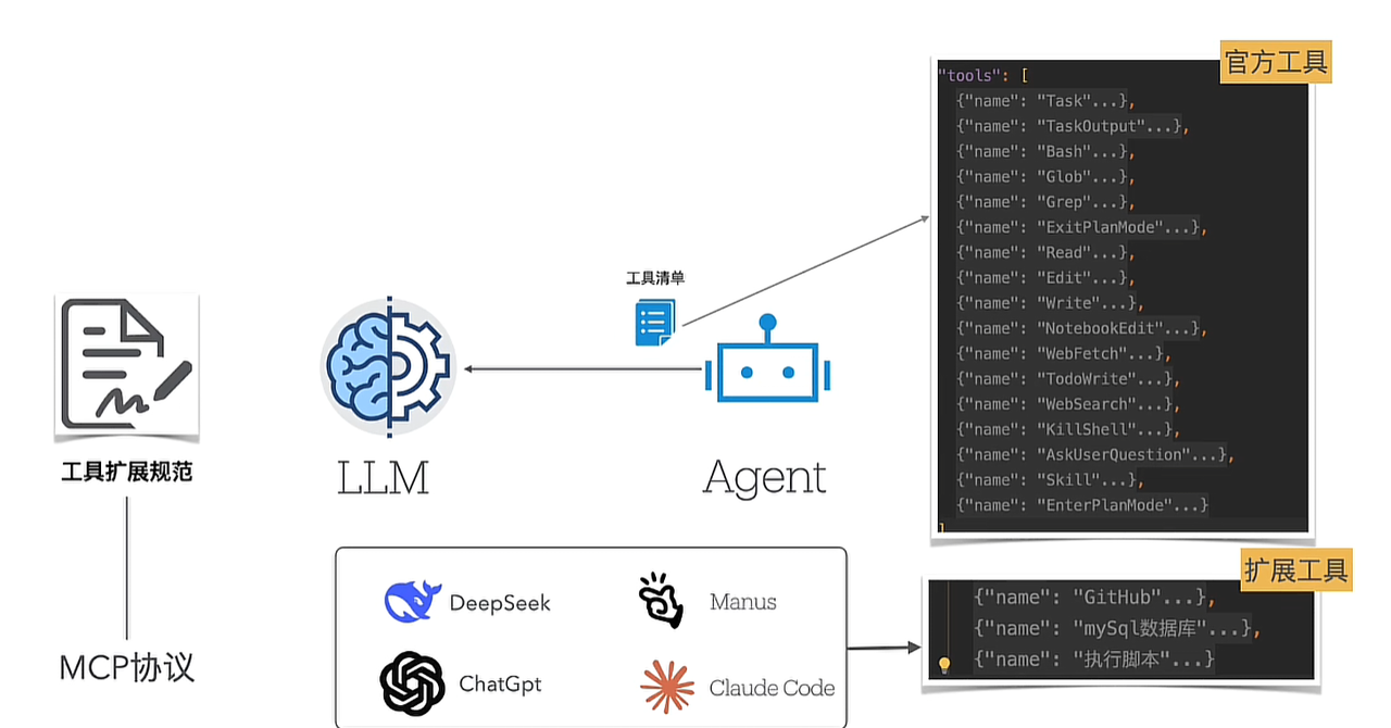 当用户发起提问的时候,Agent会将(prompt和上面的工具函数以及说明书)一起发送给内置的LLM(例如 OpenAI 或 Anthropic)