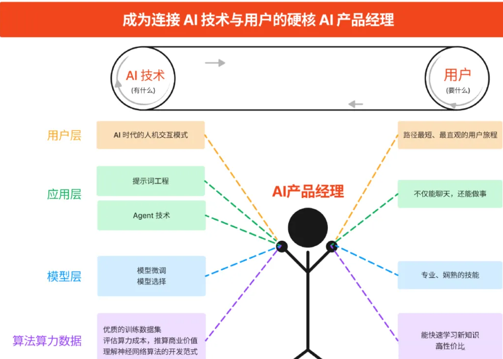 传统PM的核心能力: 用户洞察、交互设计、需求拆解、项目管理 。重点是“懂用户”,能把用户需求拆解成可落地的功能,能协调团队把产品做出来、推上线,确保用户体验流畅。