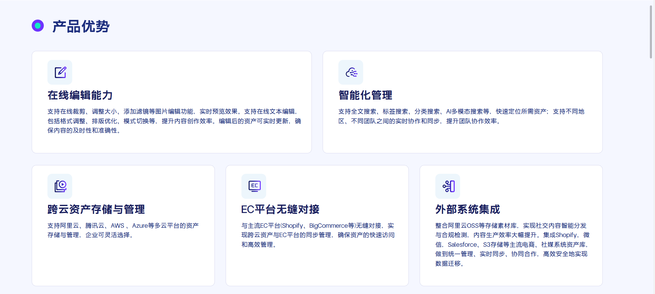 - 电商商品素材管理:智能分类、AI 以图搜图、多人员协同选片,并自动同步至电商平台