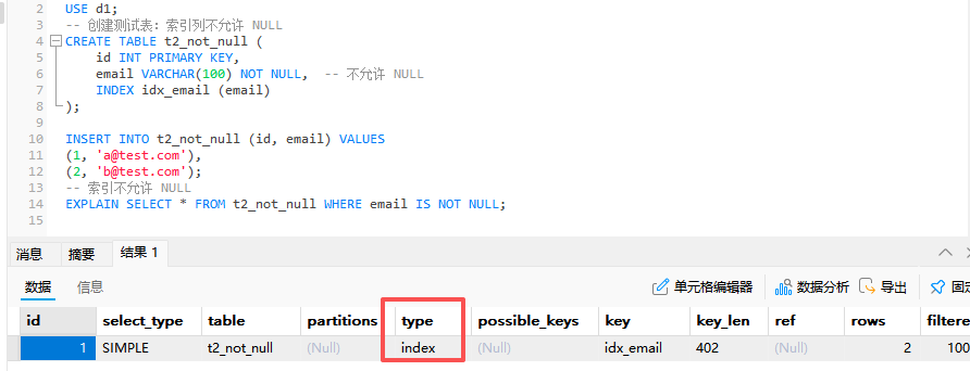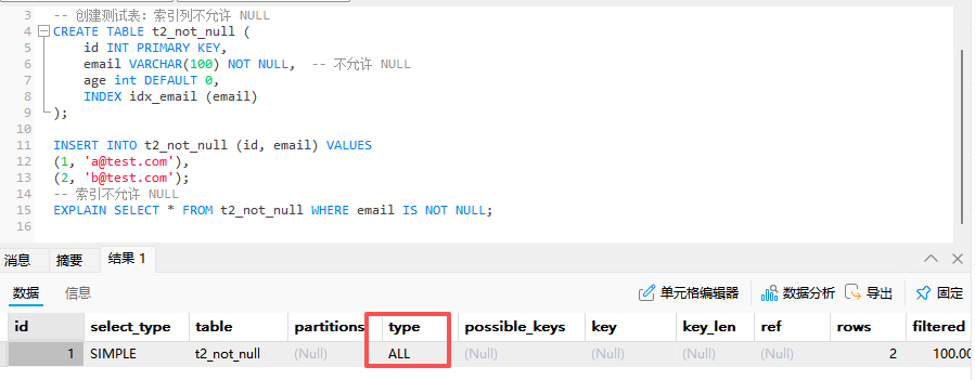 | 1 | SIMPLE | t2_not_null | [null] | ref | idx_email | idx_email | 302 | const | 1 | 100 | Using index |