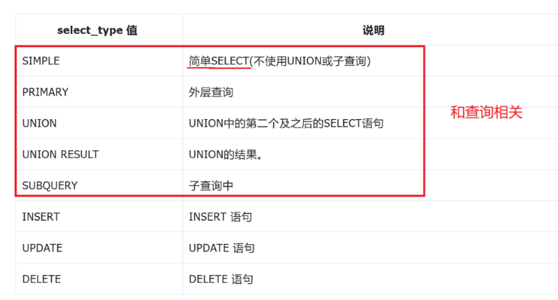 | select_type | select 类型(表示这个 select 是子查询还是最外层还是最简单的 select,主要是为了标注 select 在 sql 的位置) |
