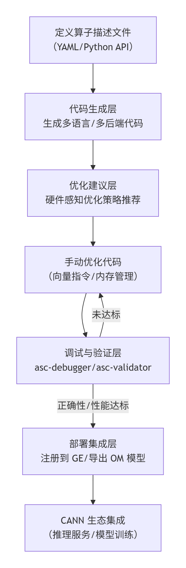 asc-devkit 是 CANN 提供的 自定义算子全生命周期开发工具包,覆盖从 算子设计→代码生成→调试优化→部署集成 的完整流程。其核心定位是:降低 CANN 算子开发门槛,提升开发效率,让“算法工程师也能快速写出高性能算子”。