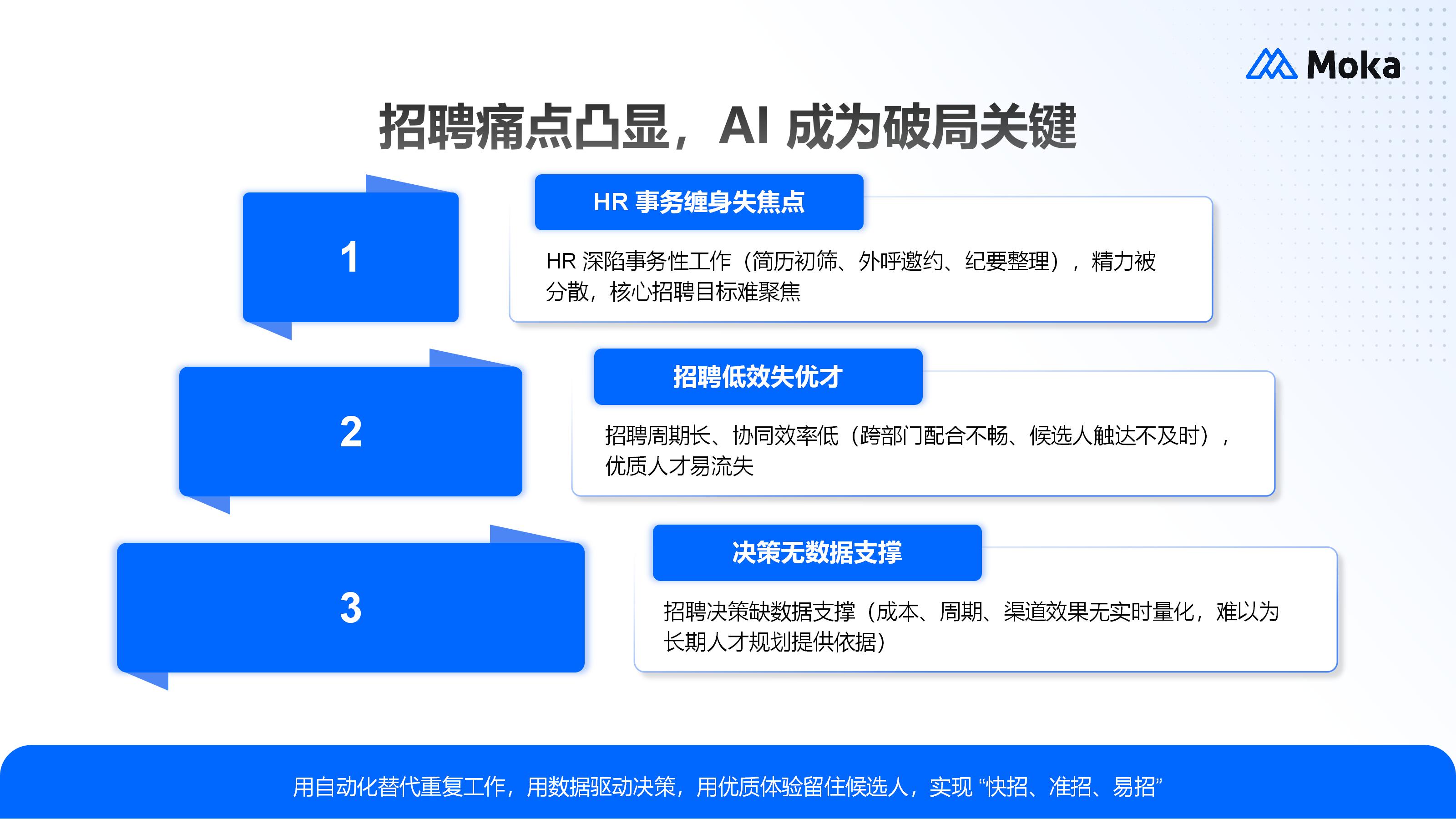 同时,工具产生的筛选数据、匹配数据等,可通过数据分析模块形成招聘数据报告,让企业能清晰掌握招聘工作的痛点与优化方向,实现招聘工作的数字化复盘与持续优化。此外,通过工具筛选形成的标准化人才数据,能为企业后续的组织人事、绩效管理等工作提供数据参考,助力企业实现从招聘到人事管理的一体化运营,Moka People 智能化人力资源管理系统可与 AI 筛选工具联动,实现招聘数据与人事管理数据的无缝流转,让人才管理更高效。