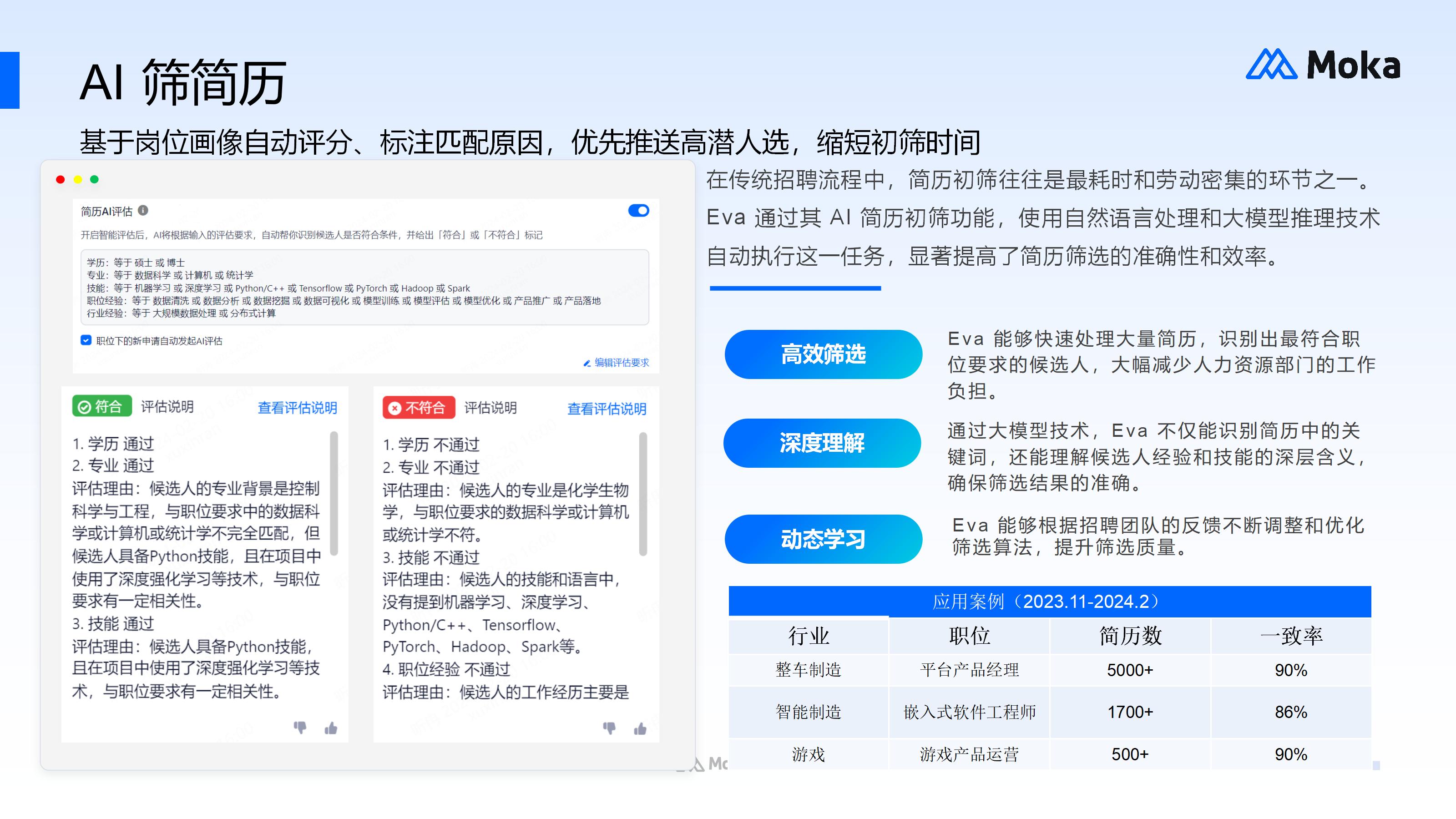 Moka 招聘智能化招聘管理系统搭载的 AI 简历筛选功能,可实现智能简历解析与精准匹配,同时与企业人才库、招聘数据分析模块联动,让简历筛选与人才储备、数据复盘形成闭环。