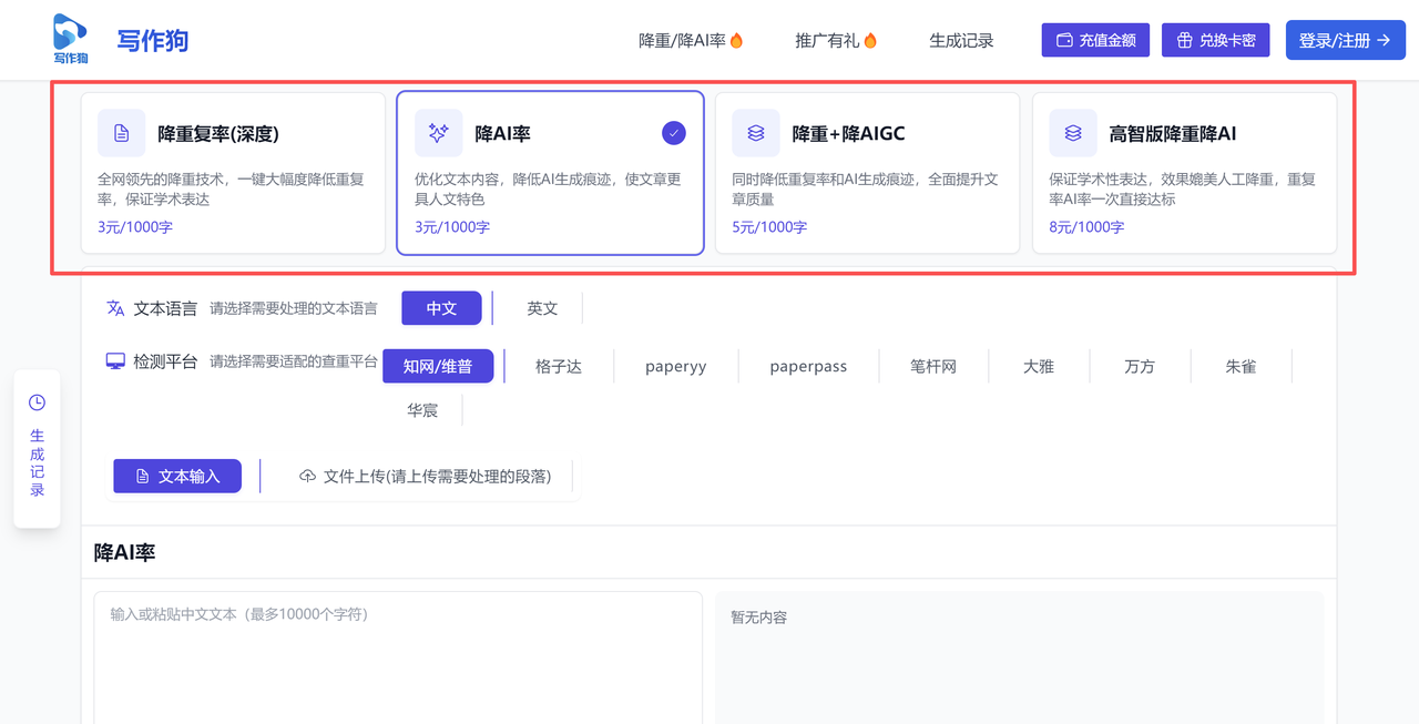 写作狗是一个综合性学术服务平台,AI智能降重是其核心服务之一。它通过多维度改写和语义替换来帮助用户降低AI率和重复率。