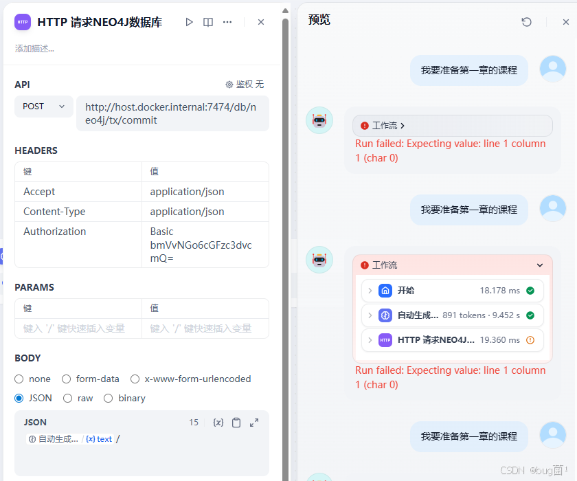 用dify创建了一个工作流,dify装在docker里,neo4j装在主机上,在http访问出现错误:Run failed:Expecting value:line 1 column ...如何解决?