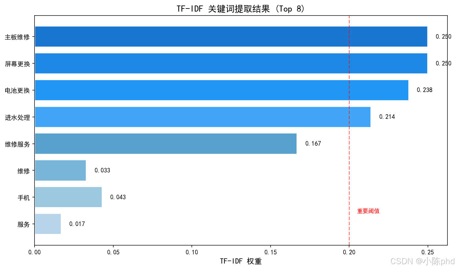 | 维修 | 0.083 | 2.303 | 0.191 | 高TF + 高IDF = 重要 |