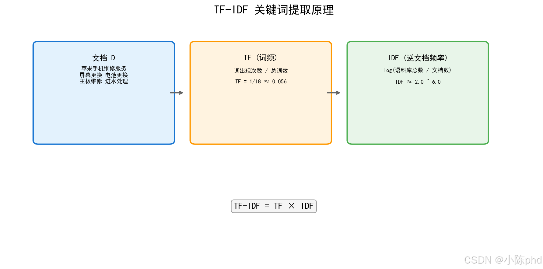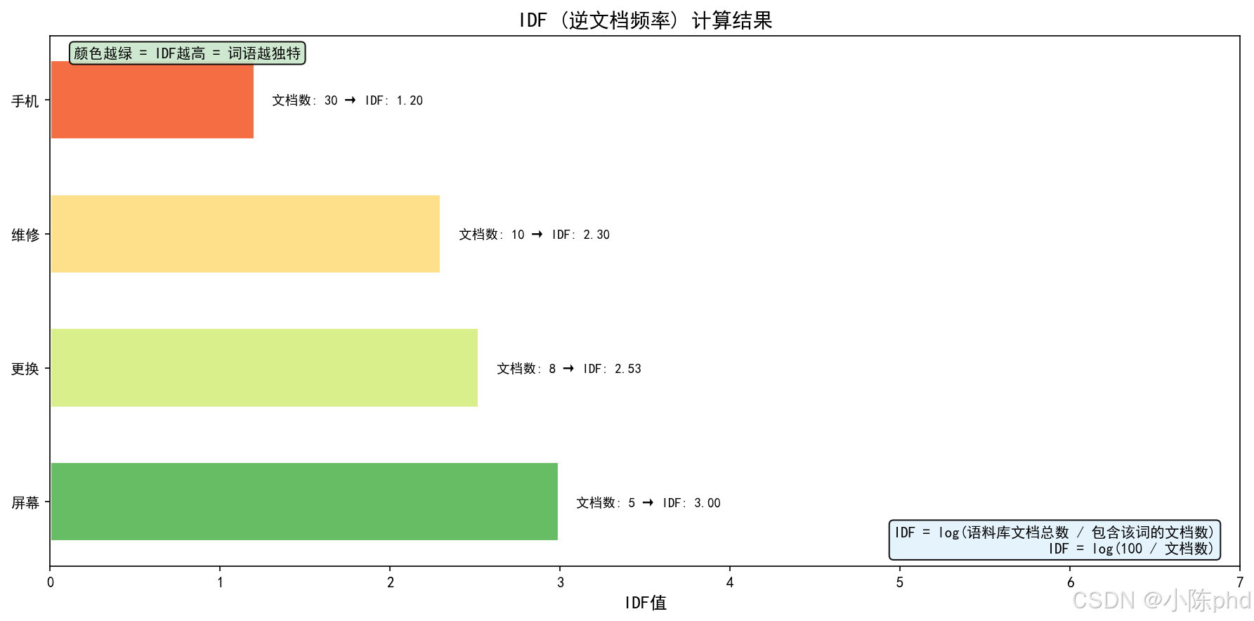 | 手机 | 0.083 | 1.204 | 0.100 | 高TF + 低IDF = 一般 |