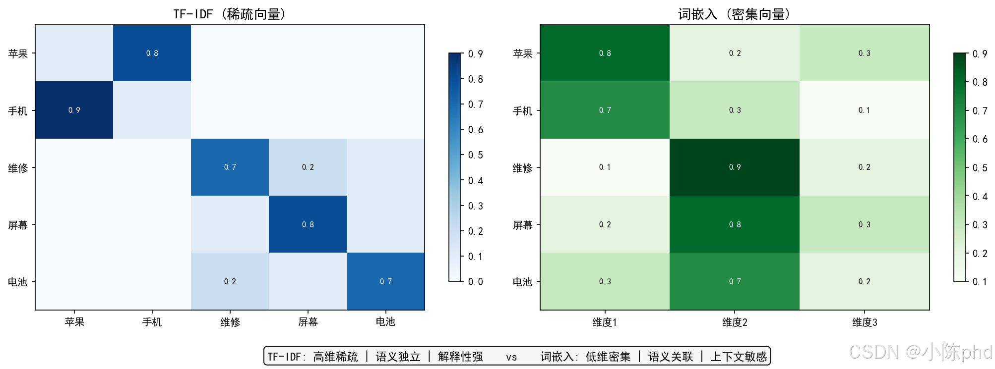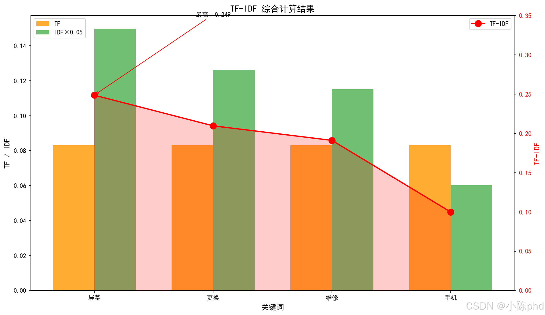 | 屏幕 | 0.083 | 2.996 | 0.249 | 高TF + 高IDF = 重要 |