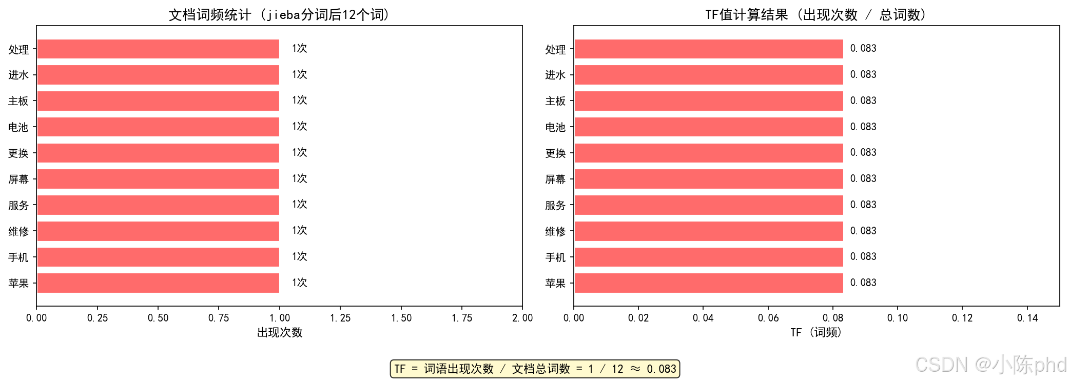 jieba分词后得到词语:苹果、手机、维修、服务、屏幕、更换、电池、主板、进水、处理(共12个词)