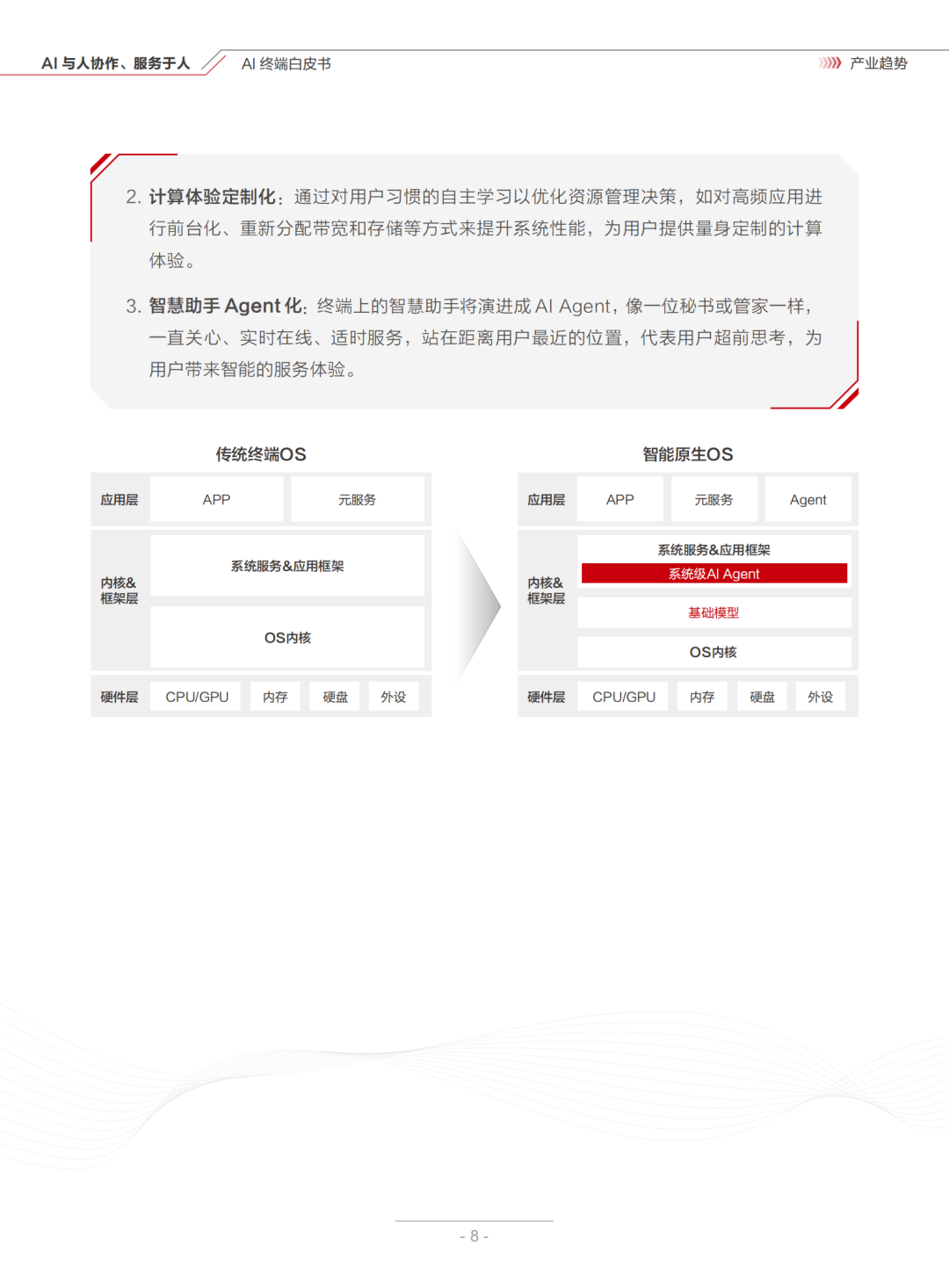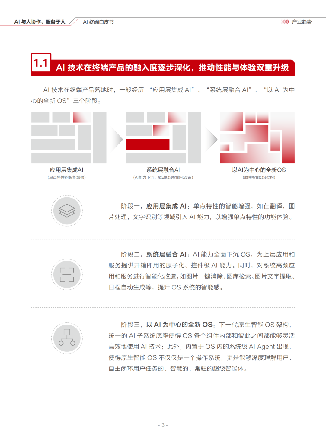 AI 技术融入终端逐步深化:历经应用层集成 AI(单点智能增强)、系统层融合 AI(AI 能力下沉改造 OS)、以 AI 为中心的原生智能 OS三个阶段,最终实现系统级原生智能,打造全场景智能体验。
